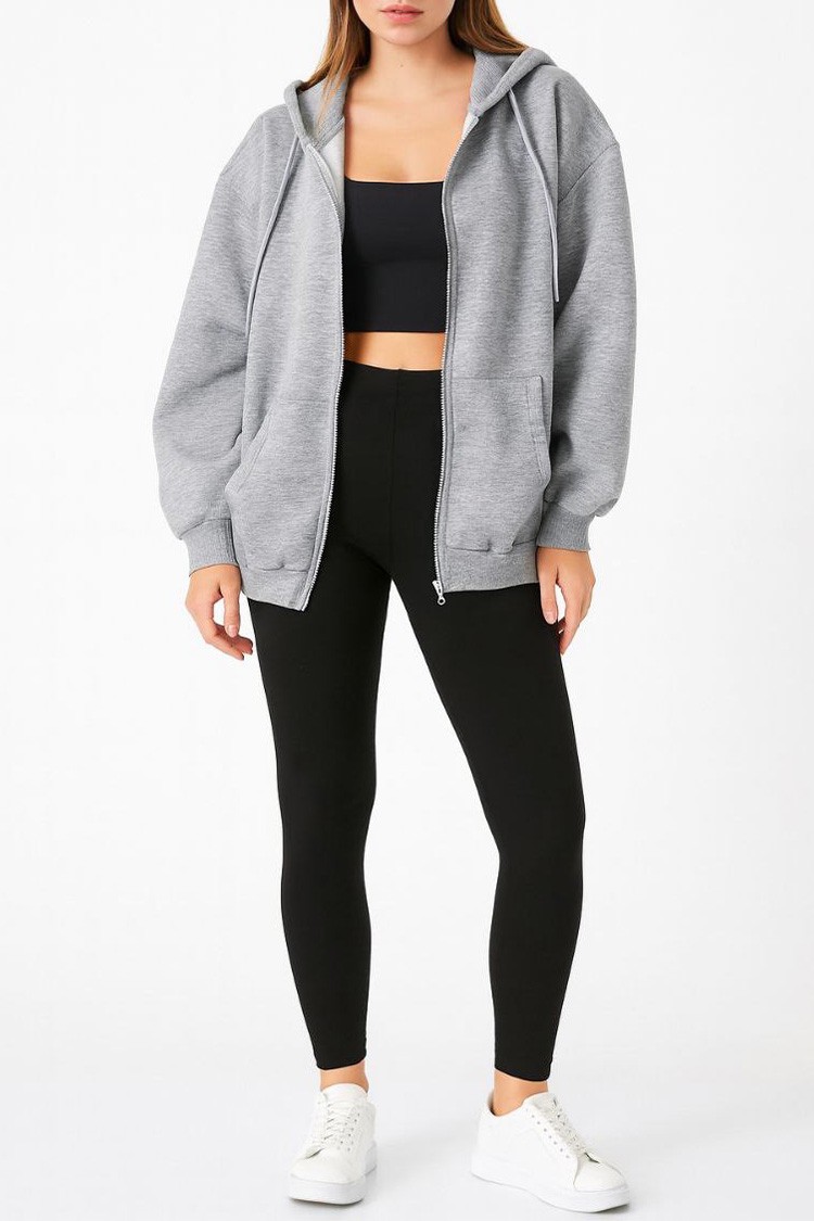 - Model ma jednolity wzór, boczne kieszenie, kaptur i luźny krój.