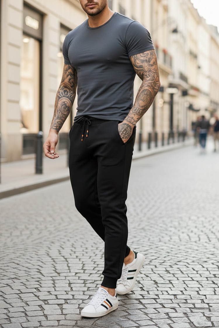 - Męskie spodnie sportowe z kieszeniami i prostymi nogawkami ze ściągaczami w rozmiarze maxi w kolorze czarnym.