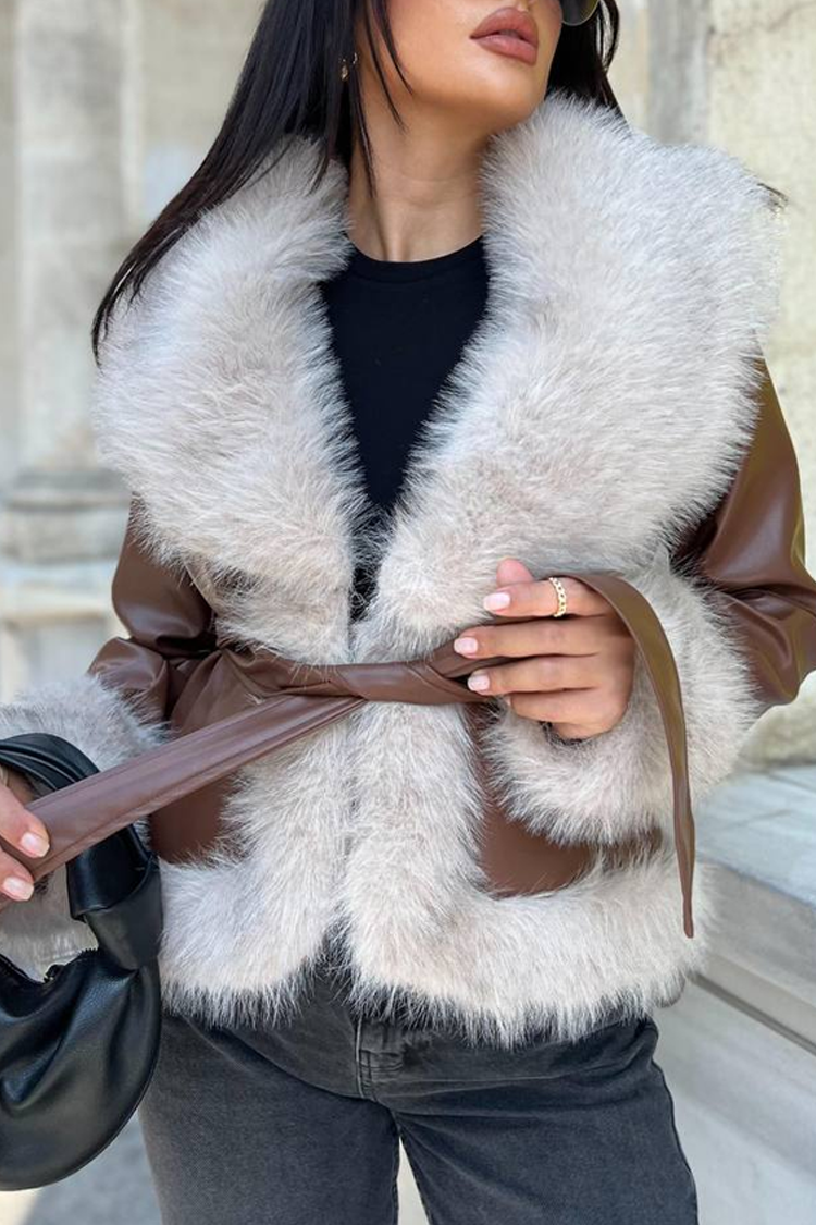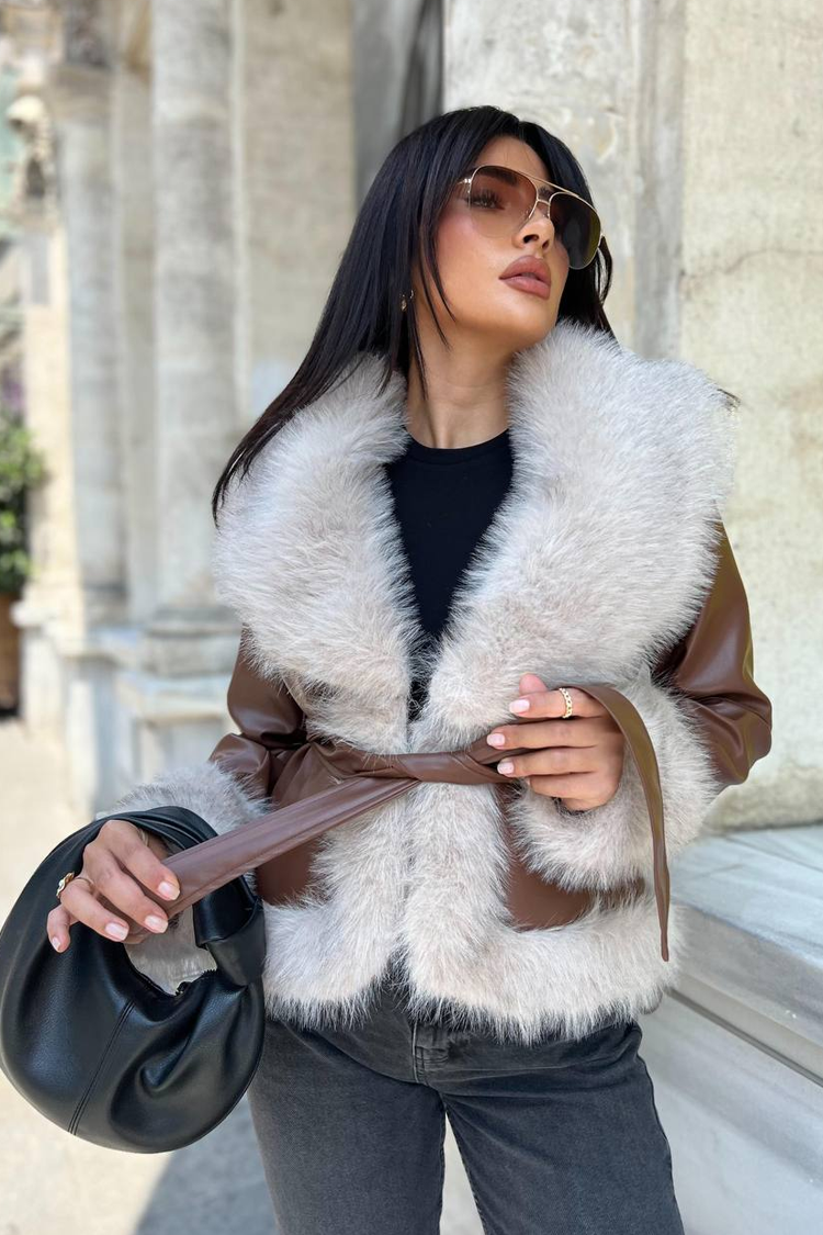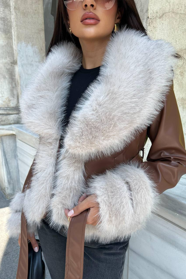 - Model wykonany z ekoskóry, z obszernym kołnierzem z futerkiem w kolorze ecru i paskiem z tego samego materiału.