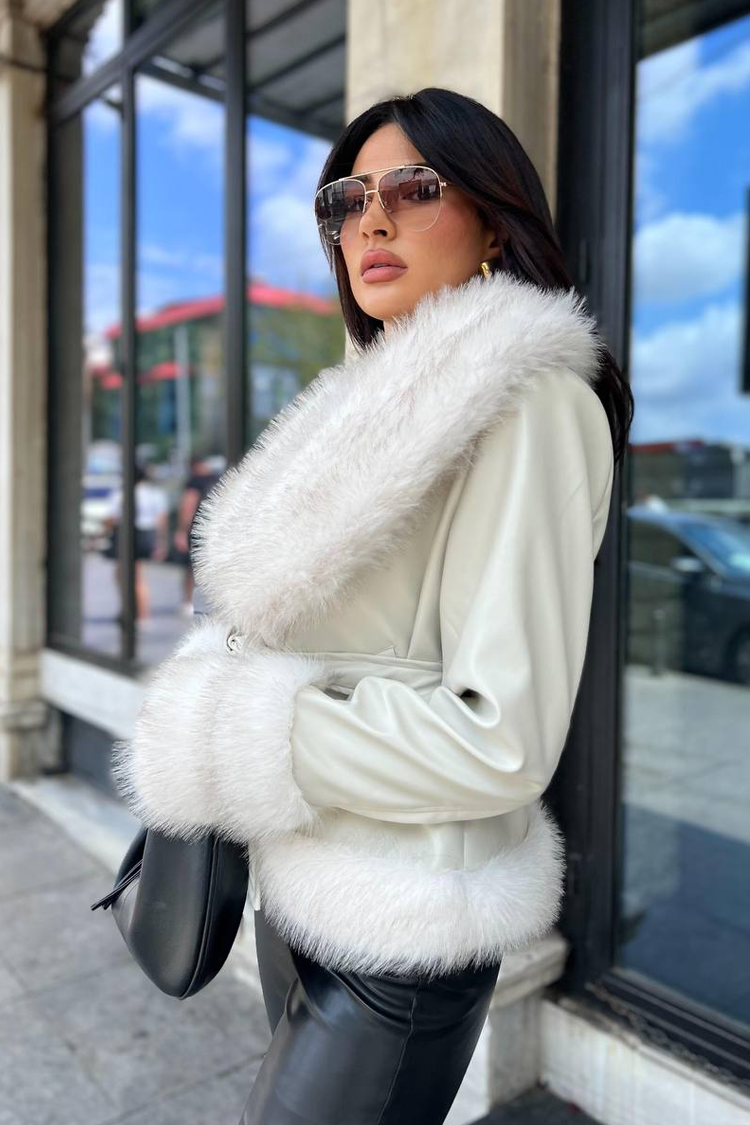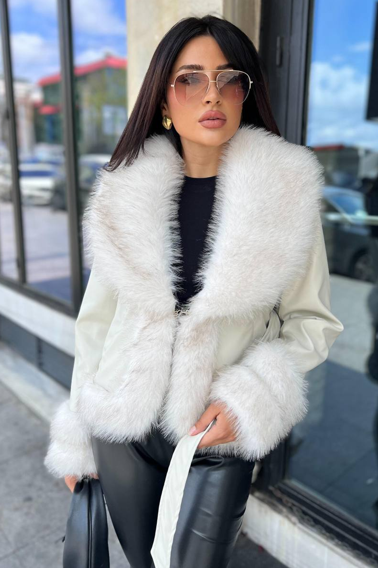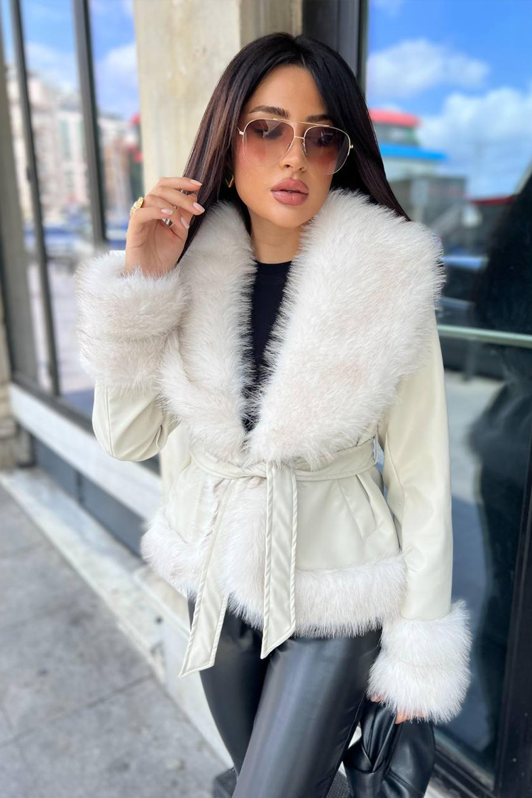 - Model wykonany z ekoskóry, z obszernym kołnierzem z futerkiem w kolorze ecru i paskiem z tego samego materiału.