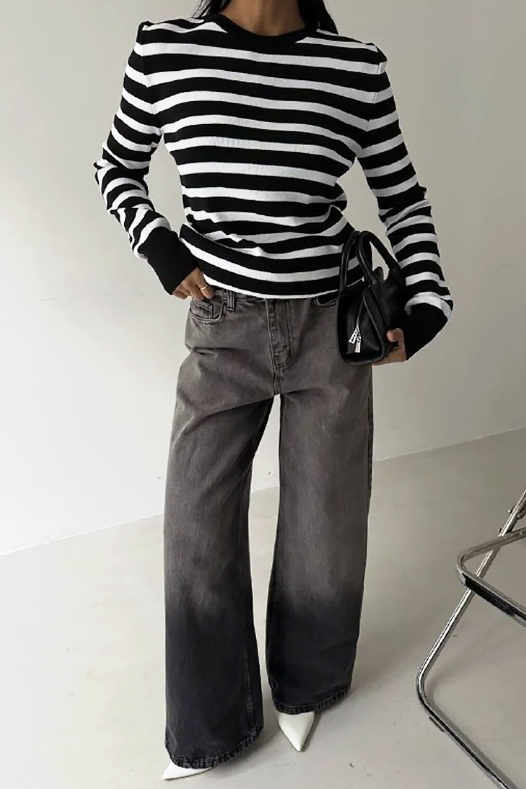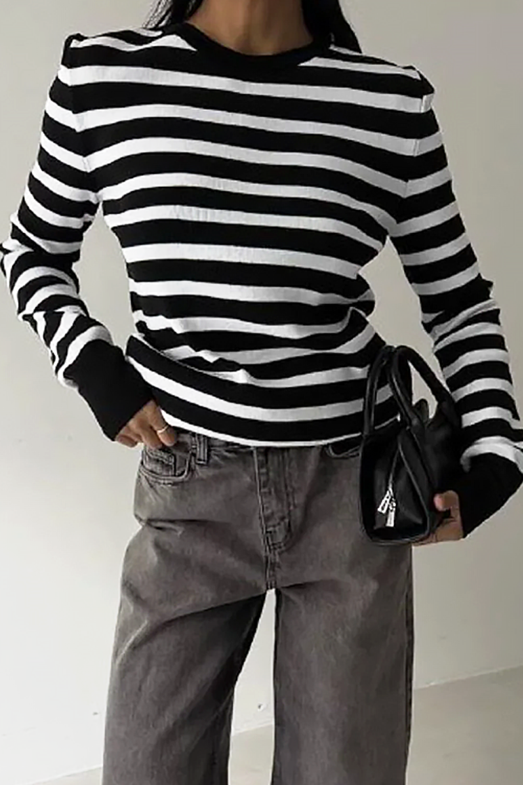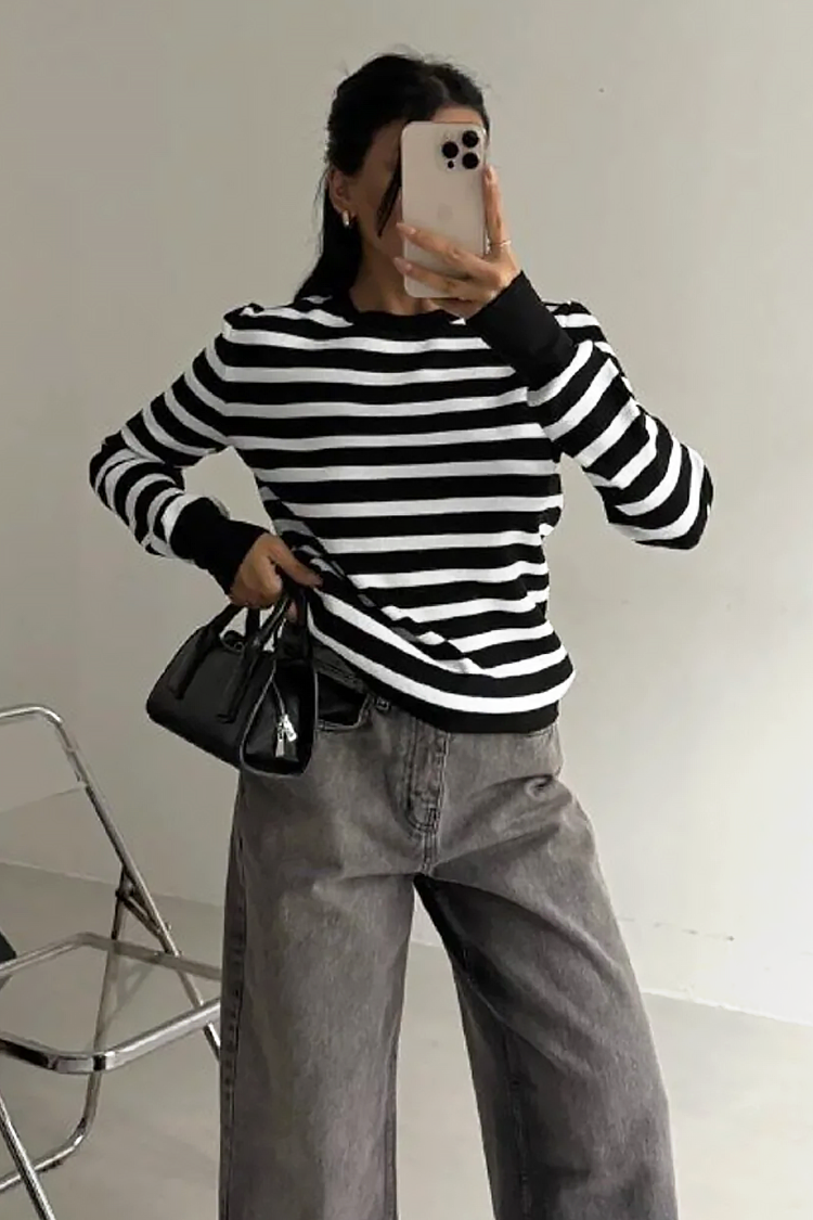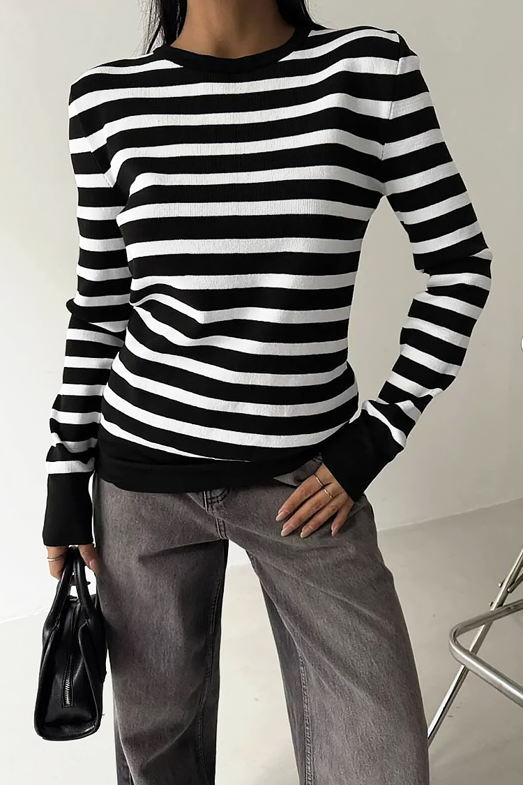- Model ma długie rękawy, klasyczny krój i wzór w paski.