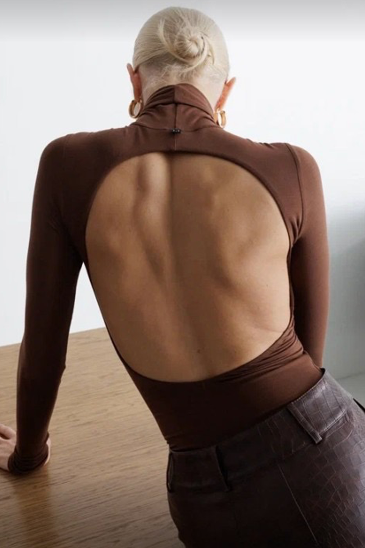 - Model ma wysoki kołnierzyk i efektowne wycięcie na plecach.