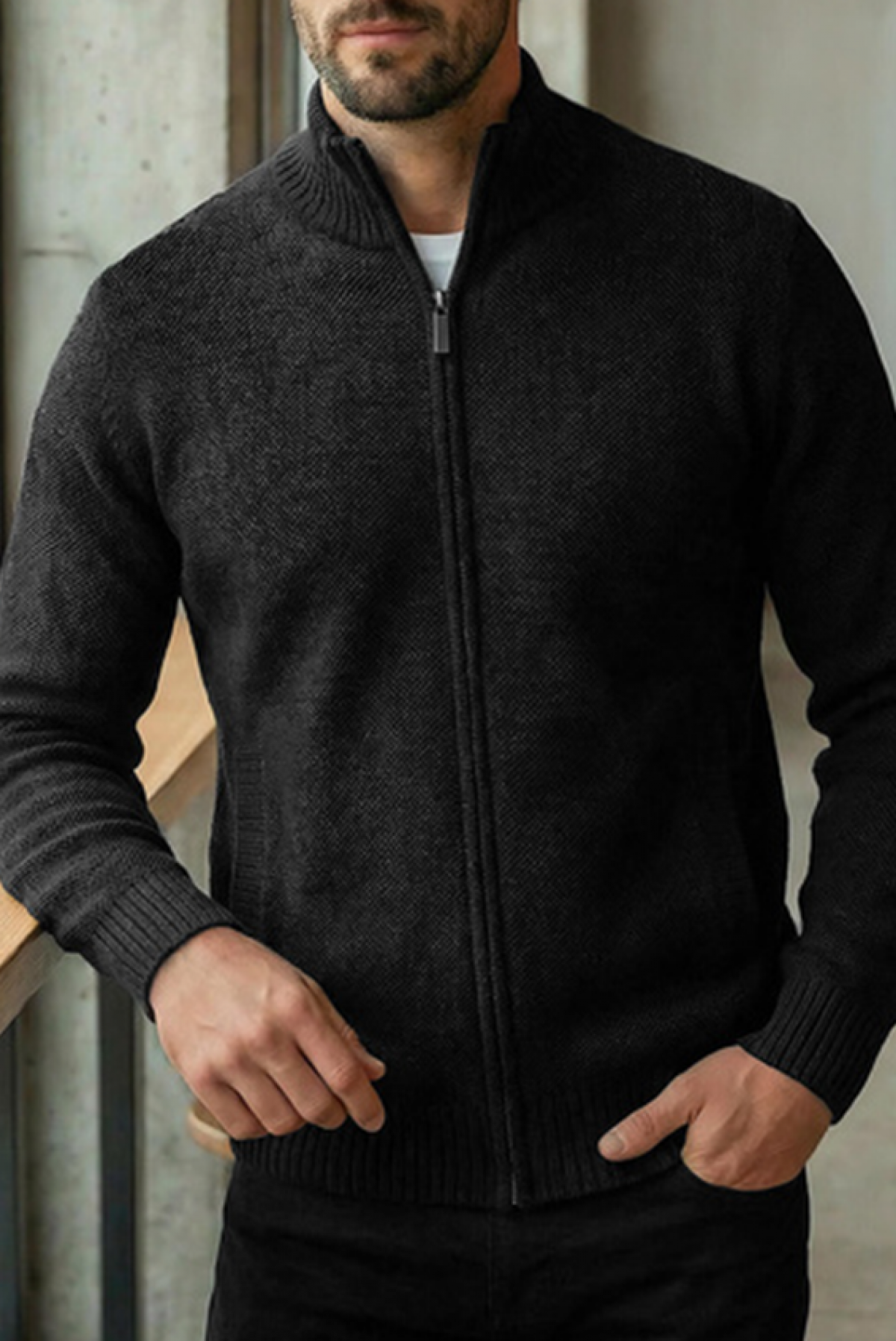 - Klasyczny męski kardigan z wysokim kołnierzem i kieszeniami w kolorze czarnym, odpowiedni na co dzień.