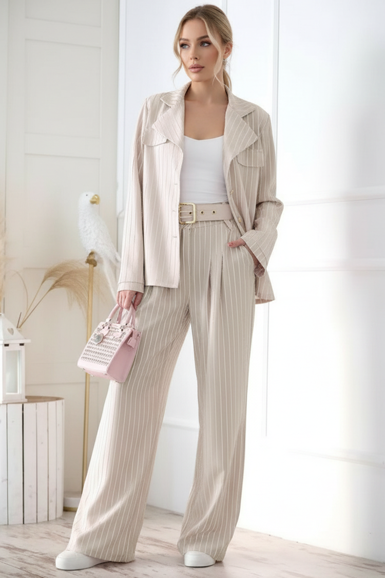 - Aby uzyskać nieskazitelny wygląd, wybierz ten trzyczęściowy komplet w paski.