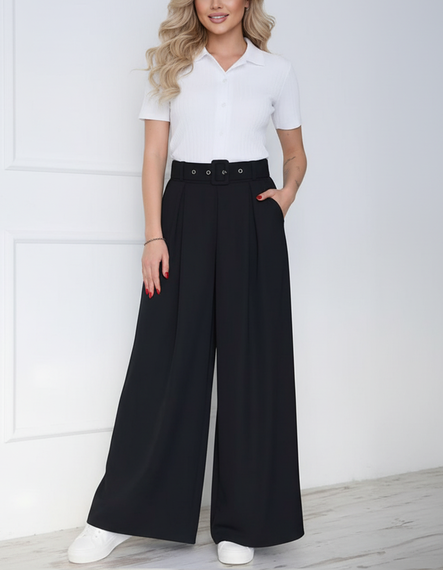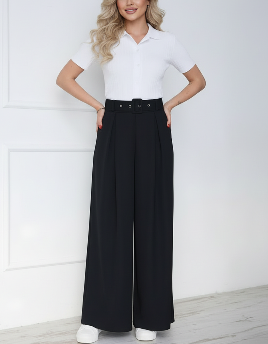 - Model ma wysoki stan, elegancki i wygodny krój oraz pasek z tego samego materiału.