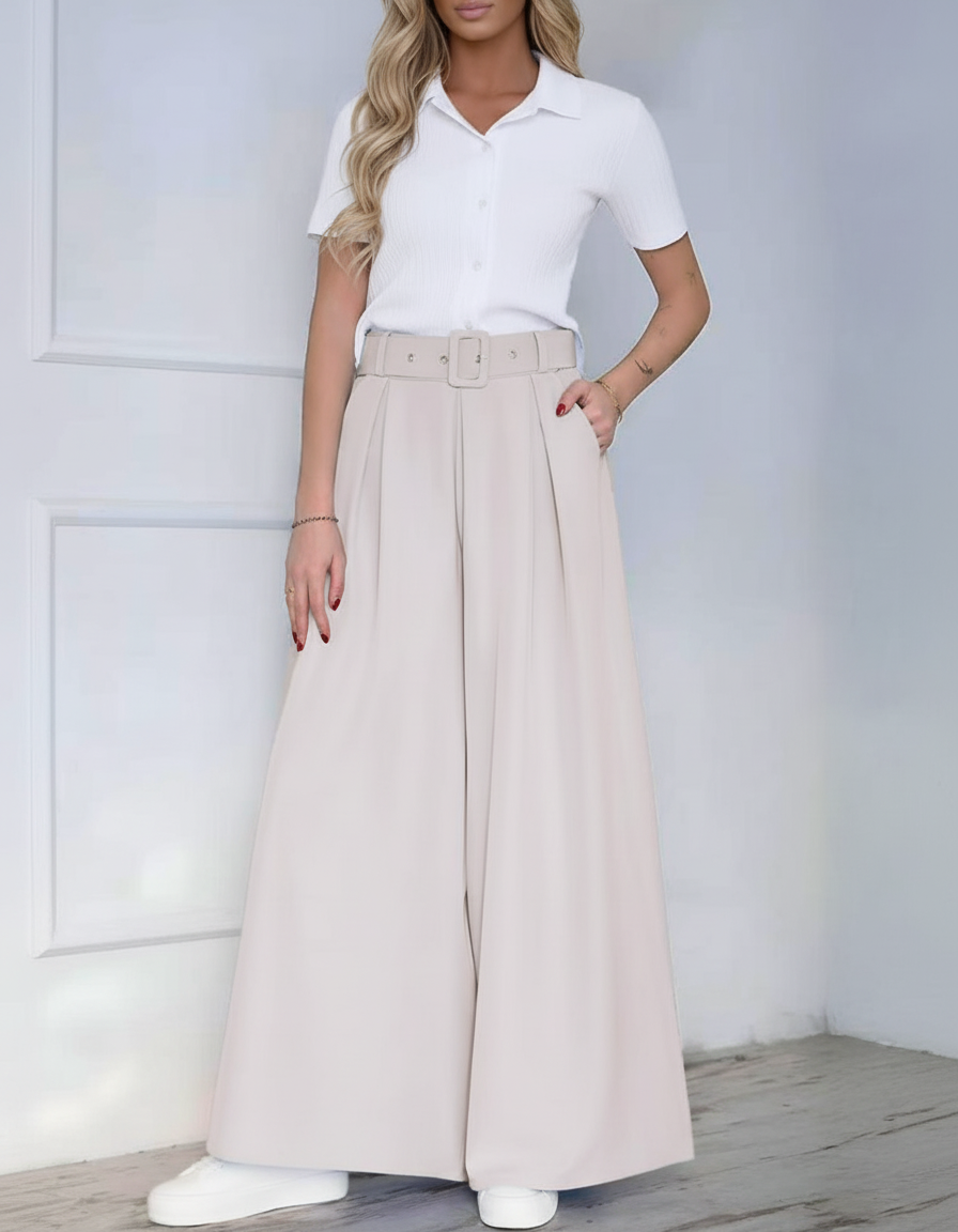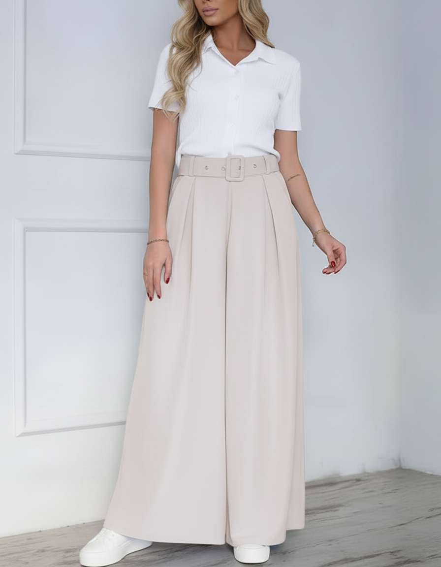 - Model ma wysoki stan, elegancki i wygodny krój oraz pasek z tego samego materiału.