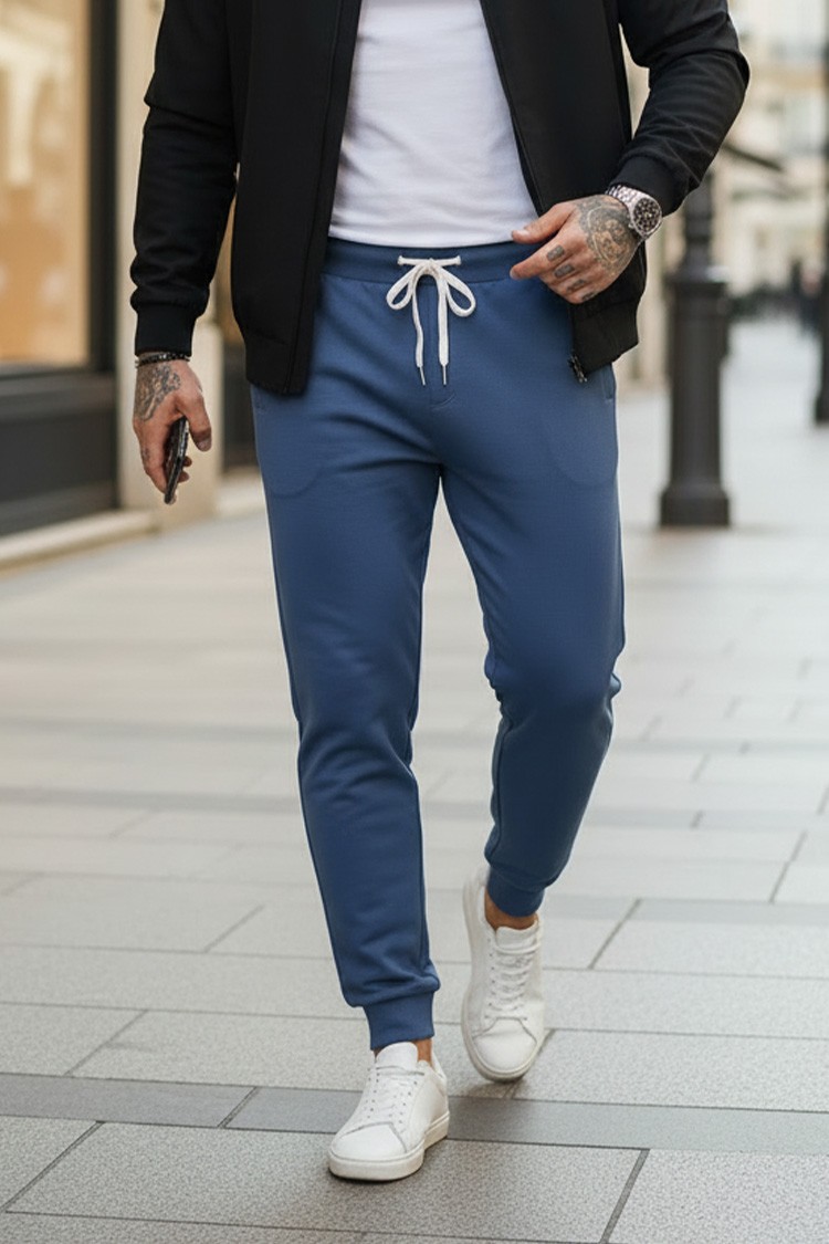 - Męskie spodnie sportowe o minimalistycznym wzornictwie w kolorze niebieskim, wykonane z bawełny.