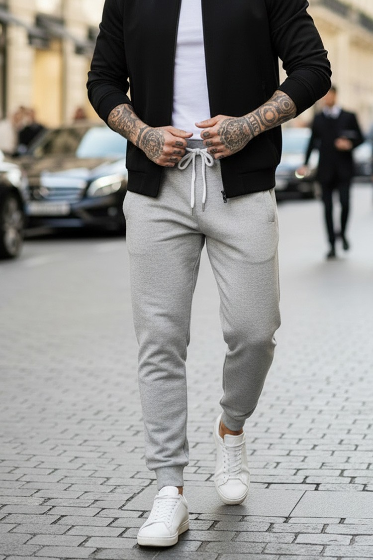 - Męskie spodnie sportowe o minimalistycznym wzornictwie w kolorze szarym, wykonane z bawełny.