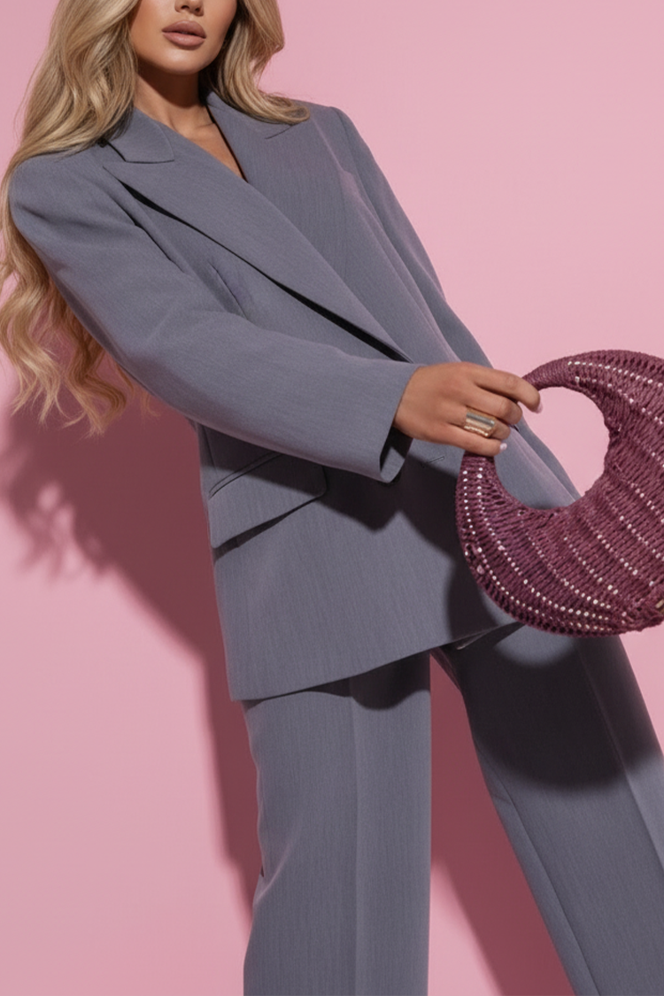 - Marynarka ma dwurzędowe zapięcie, długie rękawy i elegancki kołnierz.