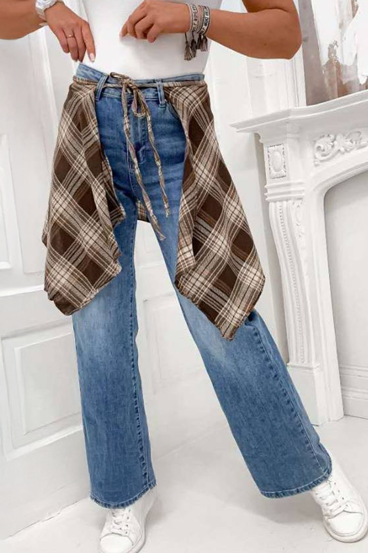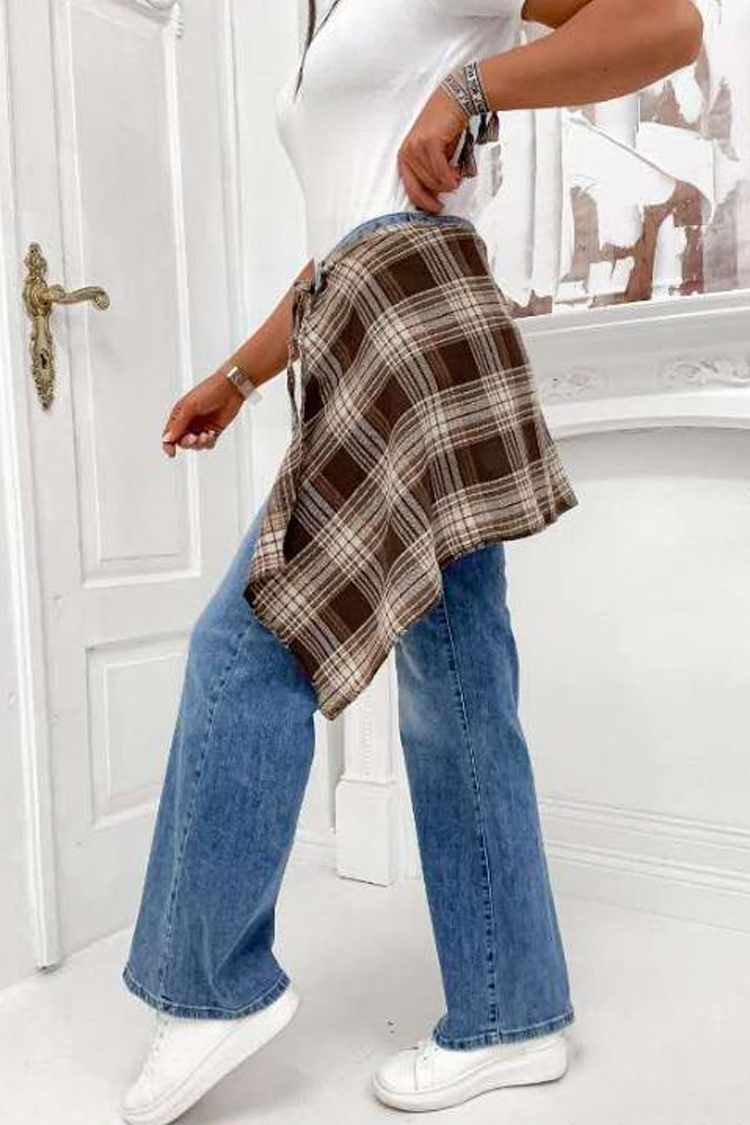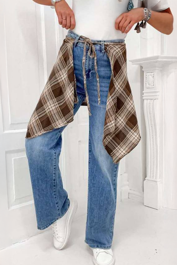 - Model ma wysoki stan, szerokie nogawki, kieszenie boczne i atrakcyjny szal w kratkę.