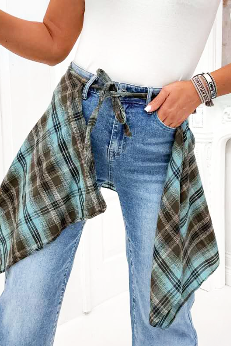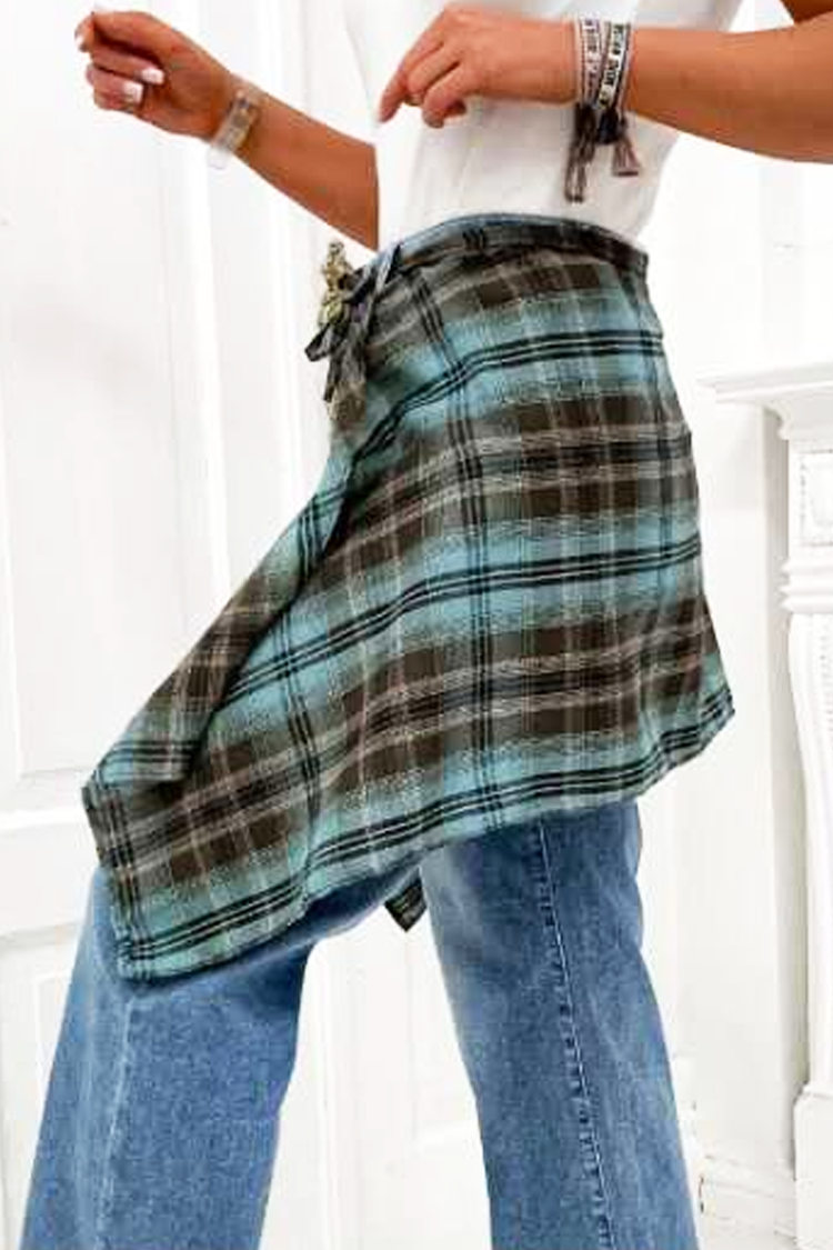 - Model ma wysoki stan, szerokie nogawki, kieszenie boczne i atrakcyjny szal w kratkę.