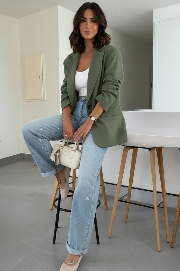 - Możesz go zestawić z topem, prostymi spodniami i butami na obcasie, aby uzyskać kompletny, elegancki look.