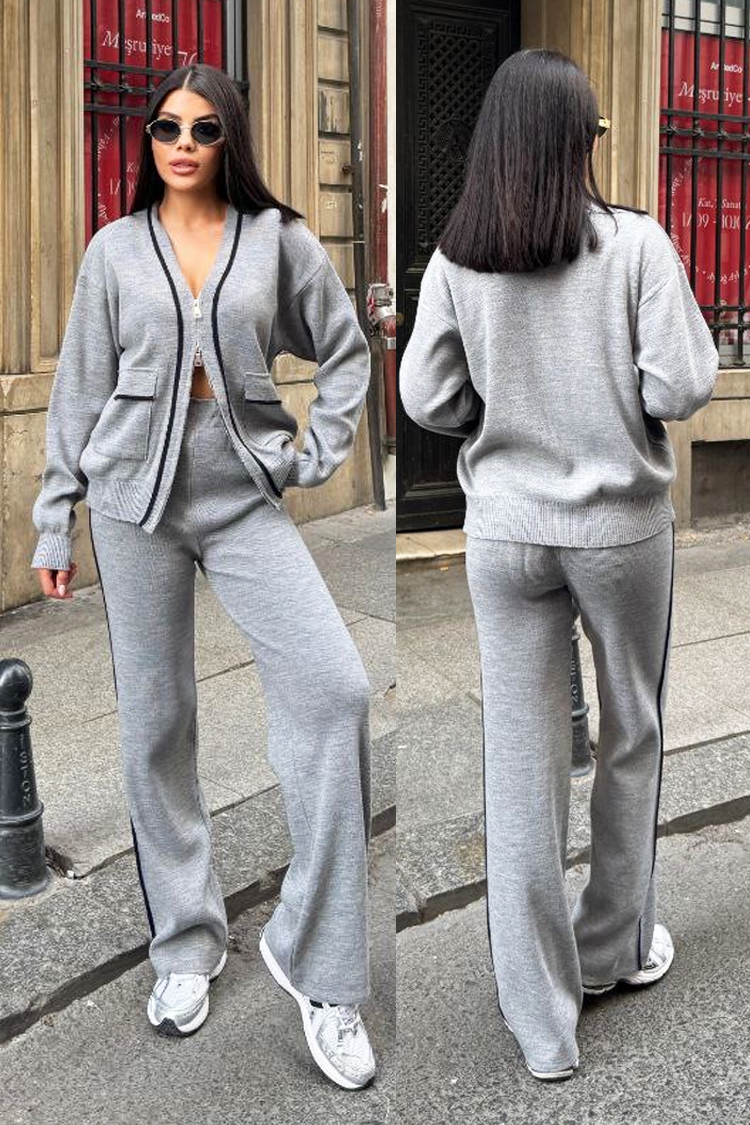 - Kardigan ma wygodny krój i zapięcie na zamek błyskawiczny. Spodnie mają wysoki stan i długie nogawki.