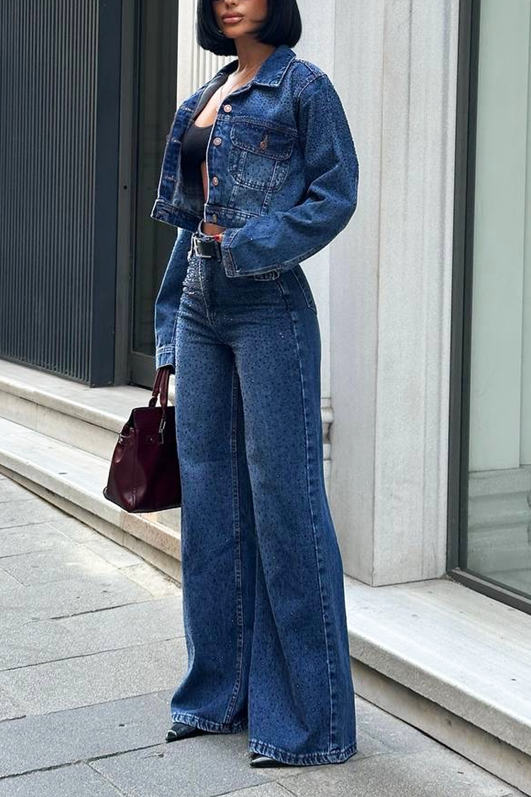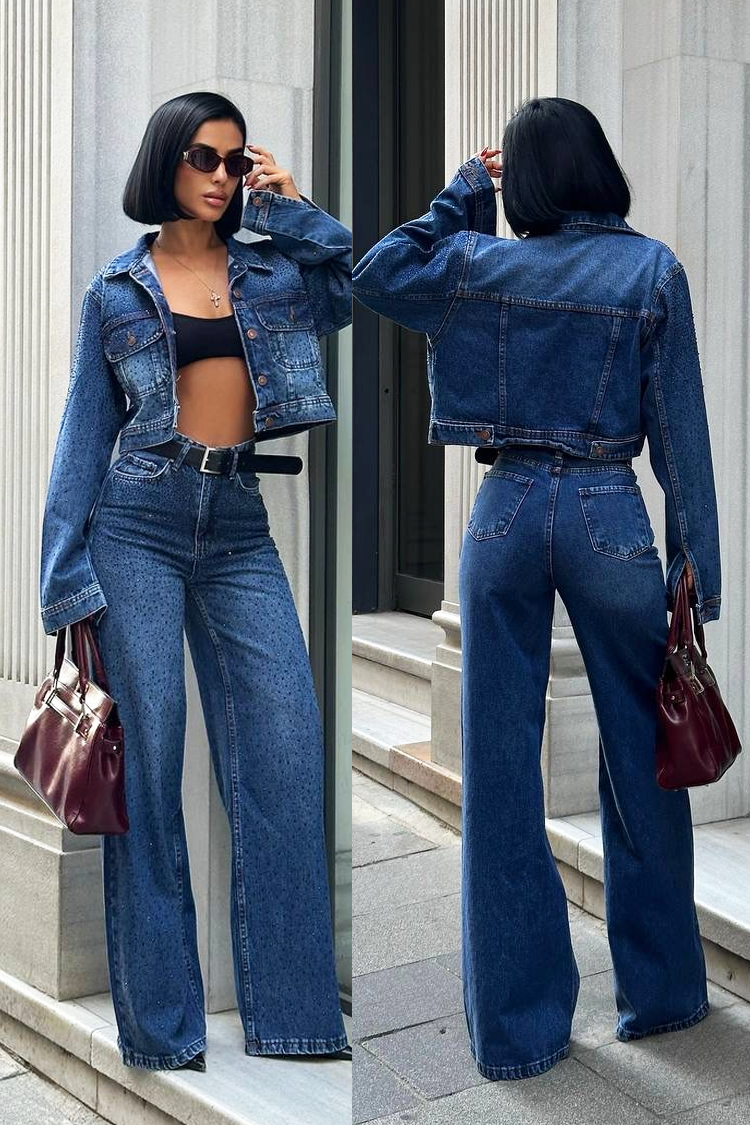 - Dwuczęściowy komplet jeansowy dla kobiet, idealny do noszenia na co dzień.