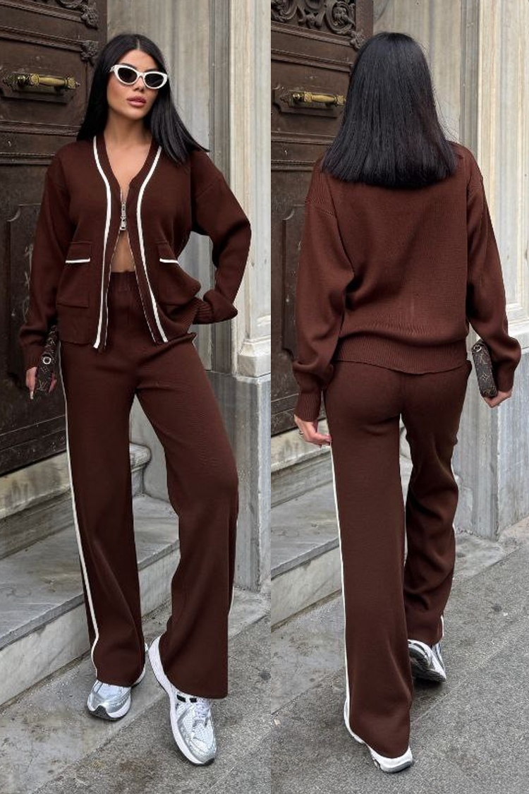 - Kardigan ma wygodny krój i zapięcie na zamek błyskawiczny. Spodnie mają wysoki stan i długie nogawki.