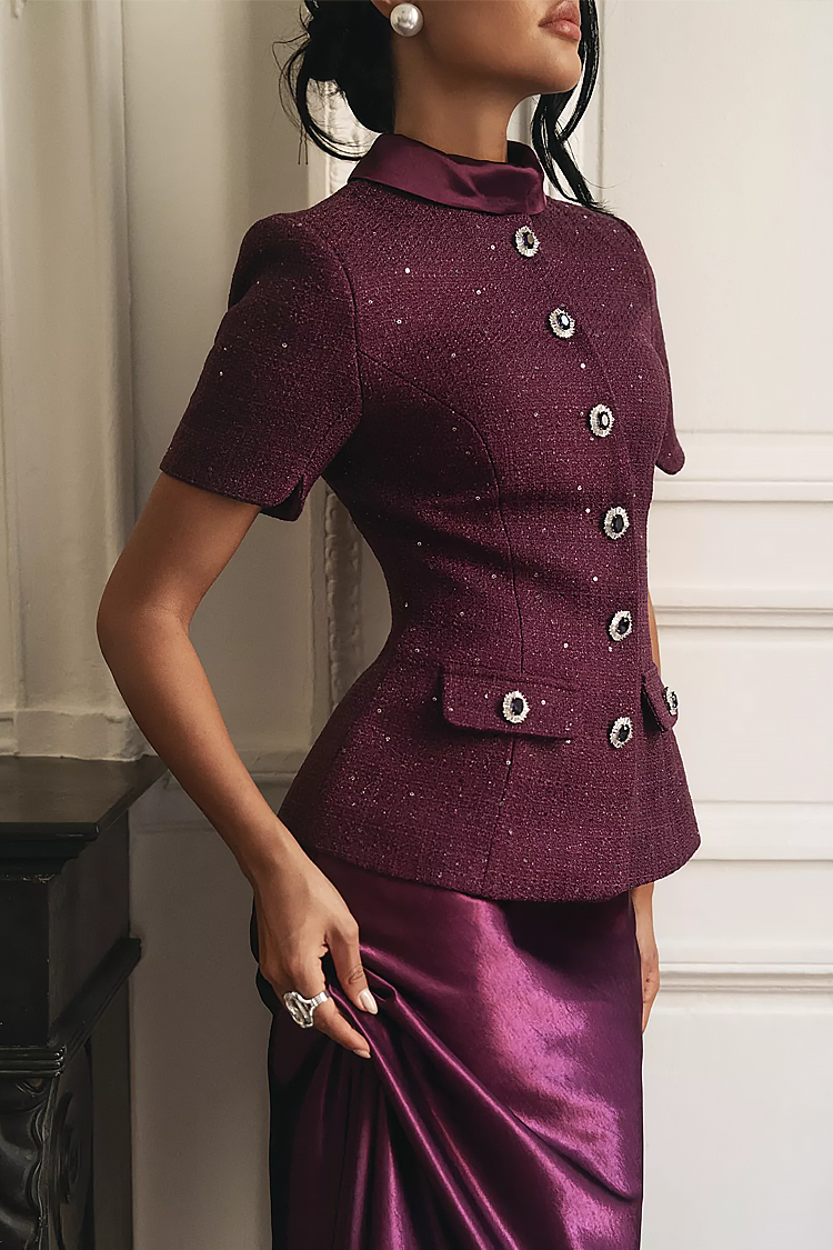 - Żakiet ma efektowne guziki z przodu, ozdobne kieszenie i krótkie rękawy.