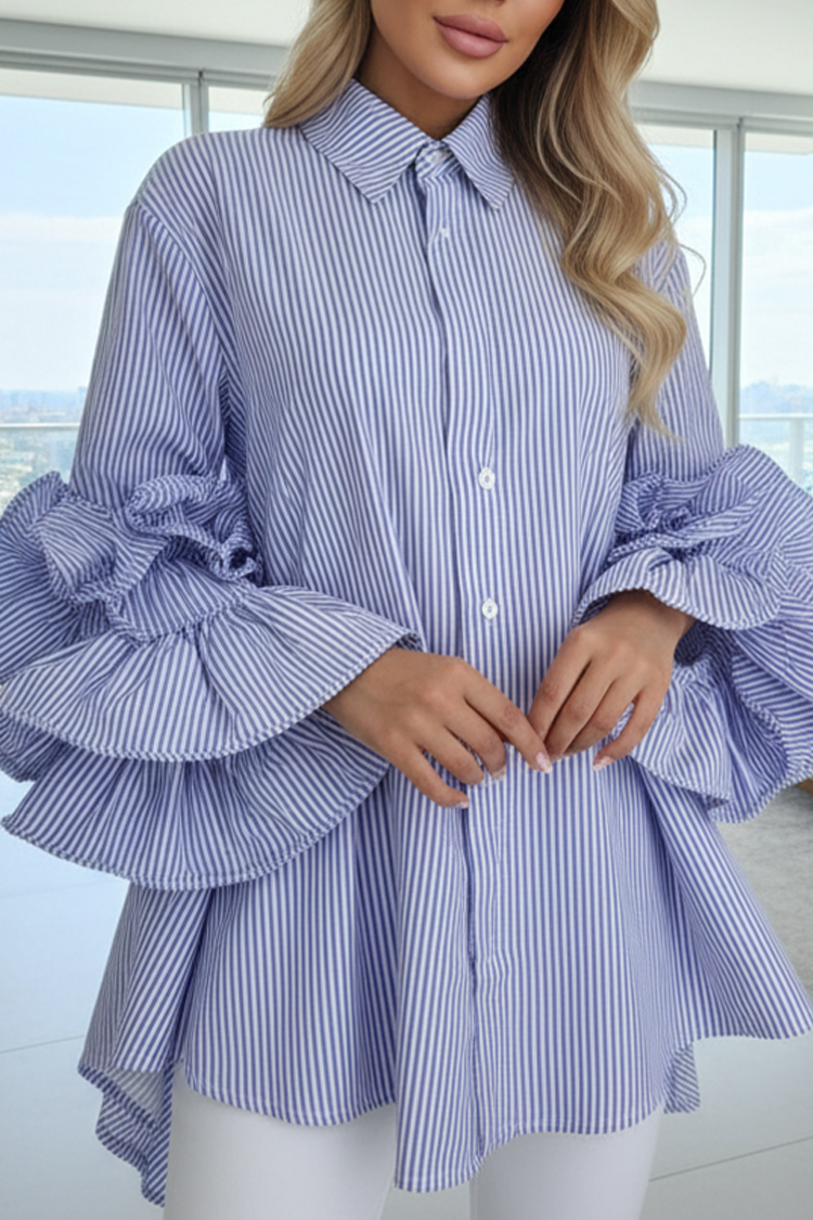 - Model zapinany jest na całej długości na guziki, ma efektowne falbany i wzór w paski.