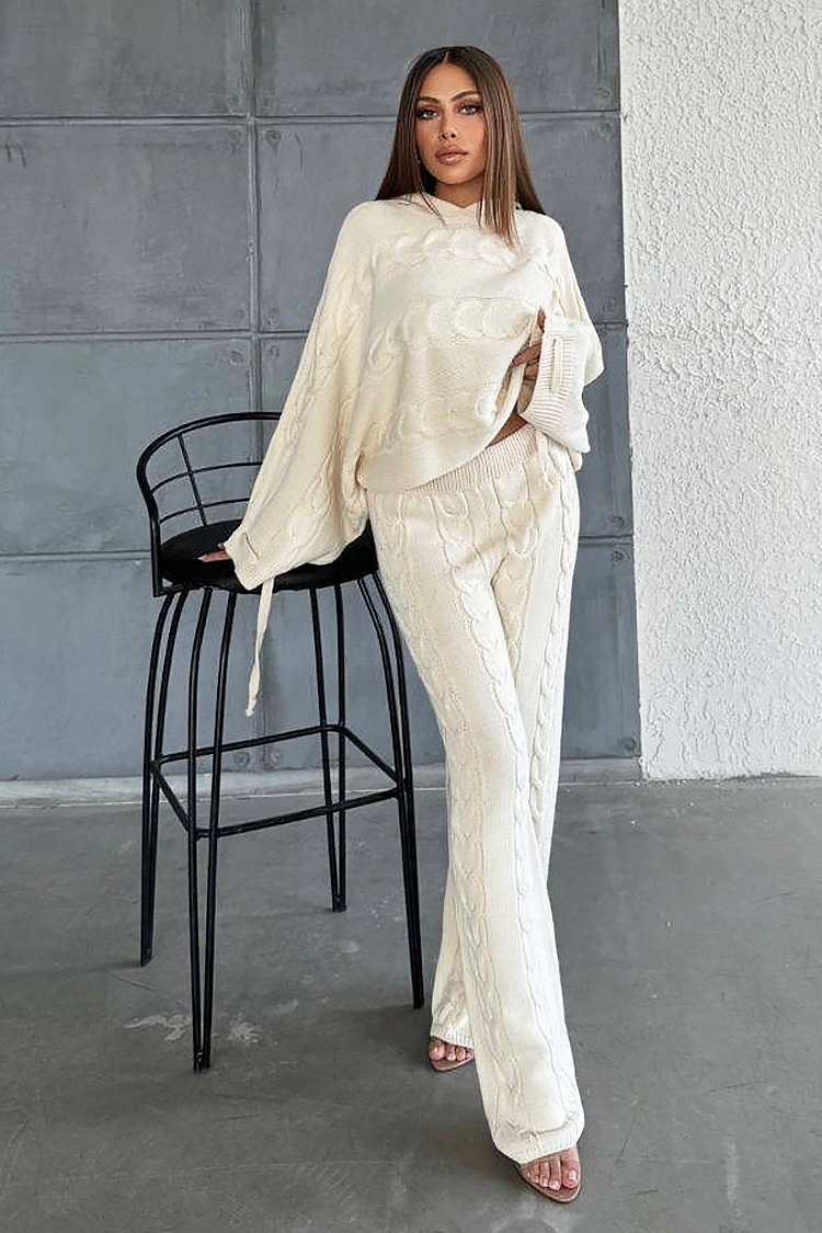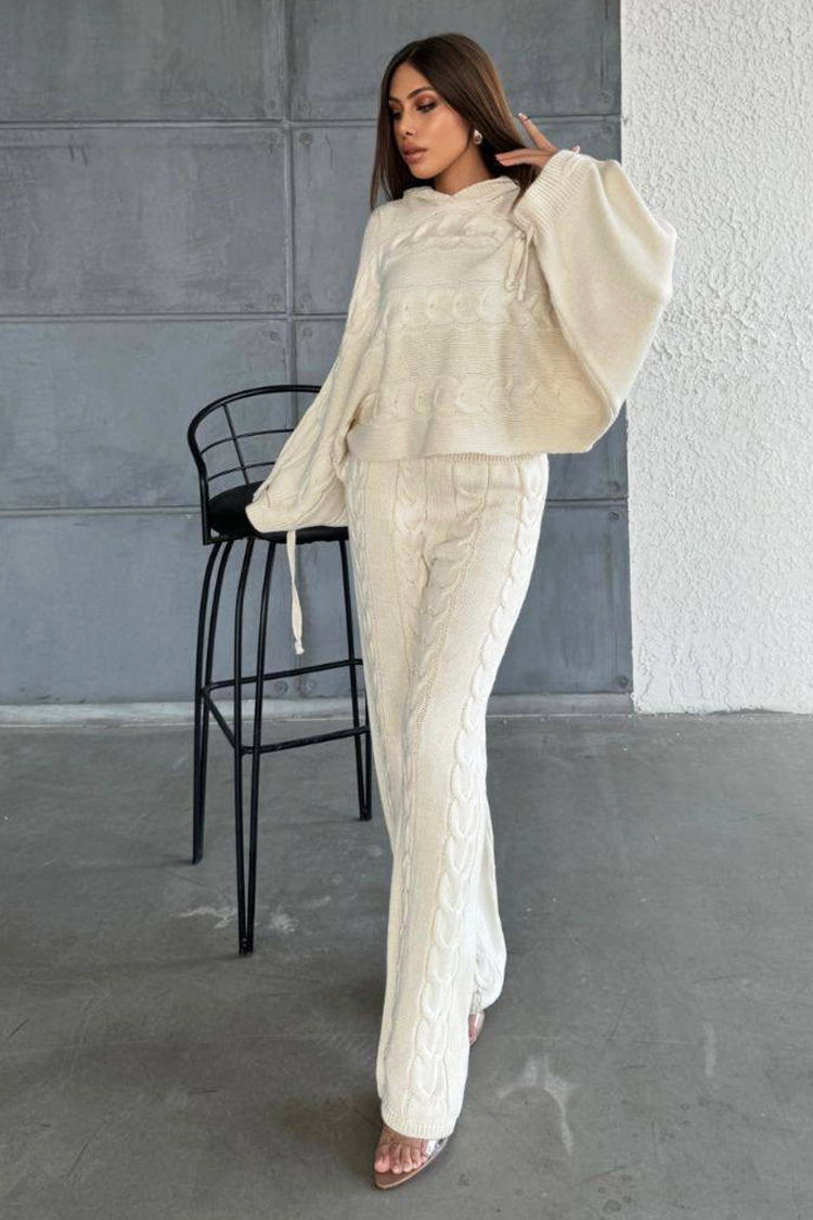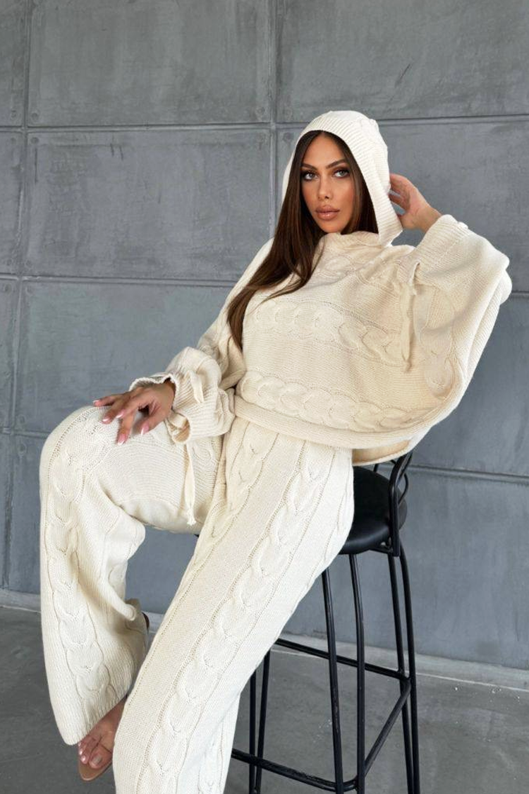 - Bluza ma luźny krój i kaptur, a spodnie rozszerzane i z wysokim stanem.