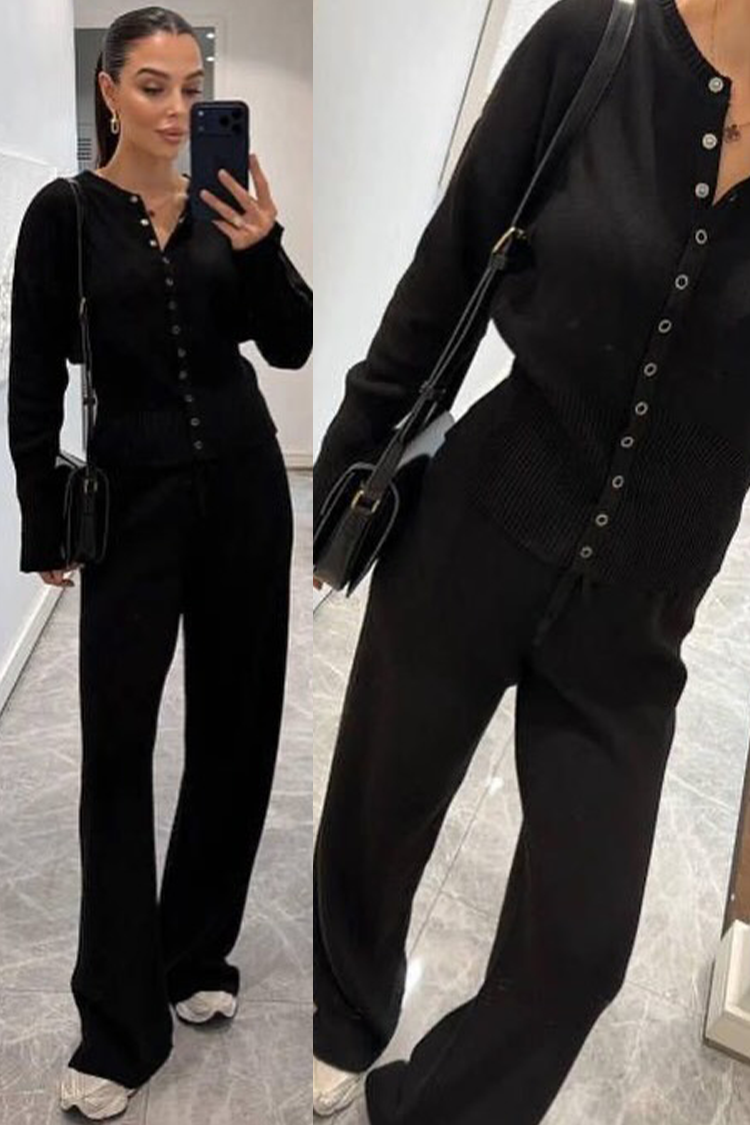 - Kardigan ma klasyczny krój i guziki, a spodnie mają wygodny krój i wysoki stan.