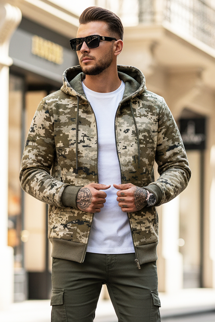 - Nowoczesna męska bluza w kamuflażu i kieszeniami, idealna na co dzień lub na spacer.