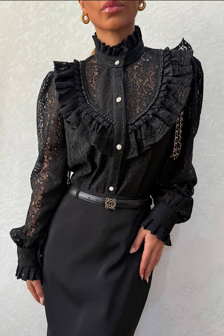 - Model zapinany jest na całej długości na guziki, ma stylowy krój i efektowne falbanki, koronkę i ozdobne perełki.