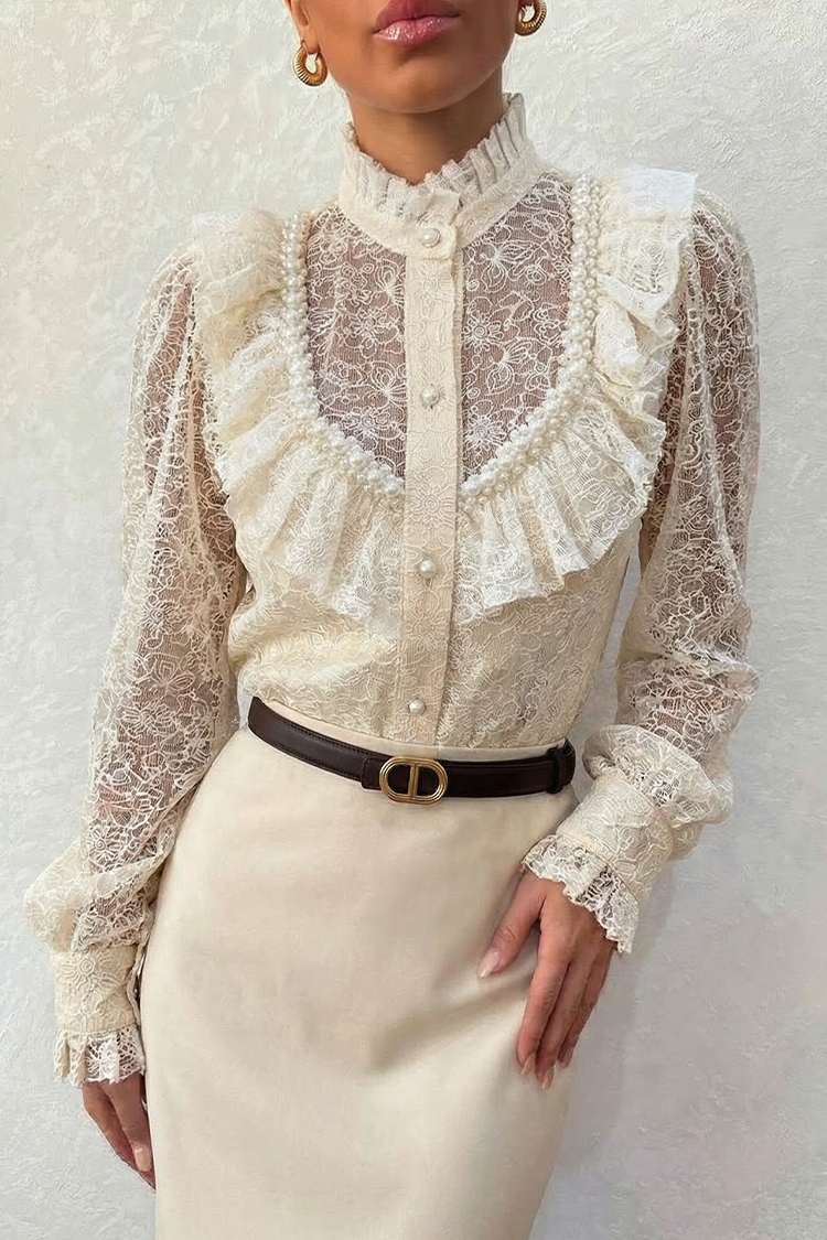 - Model zapinany jest na całej długości na guziki, ma stylowy krój i efektowne falbanki, koronkę i ozdobne perełki.