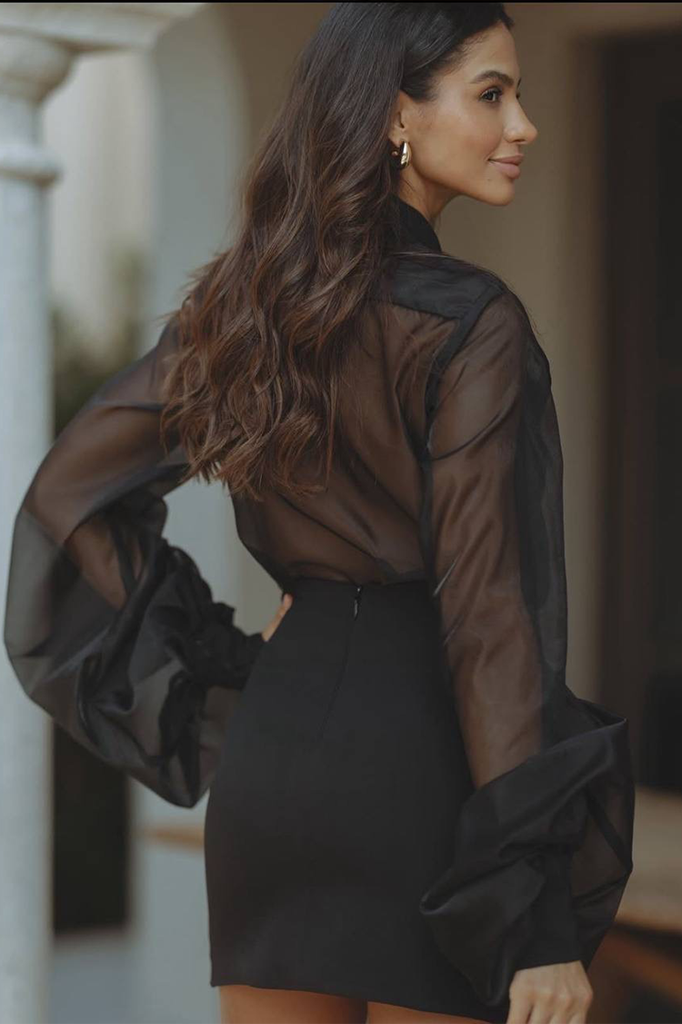 - Bluzka ma długie bufiaste rękawy, kołnierzyk i transparentny materiał, a spódnica jest krótka i seksownie dopasowana.