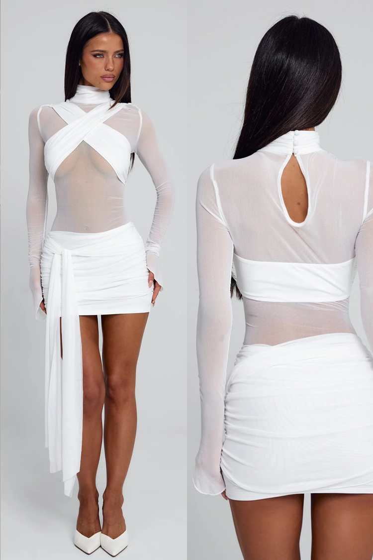 - Model ma seksowny, dopasowany krój, długie rękawy, biały kolor i transparentne detale.