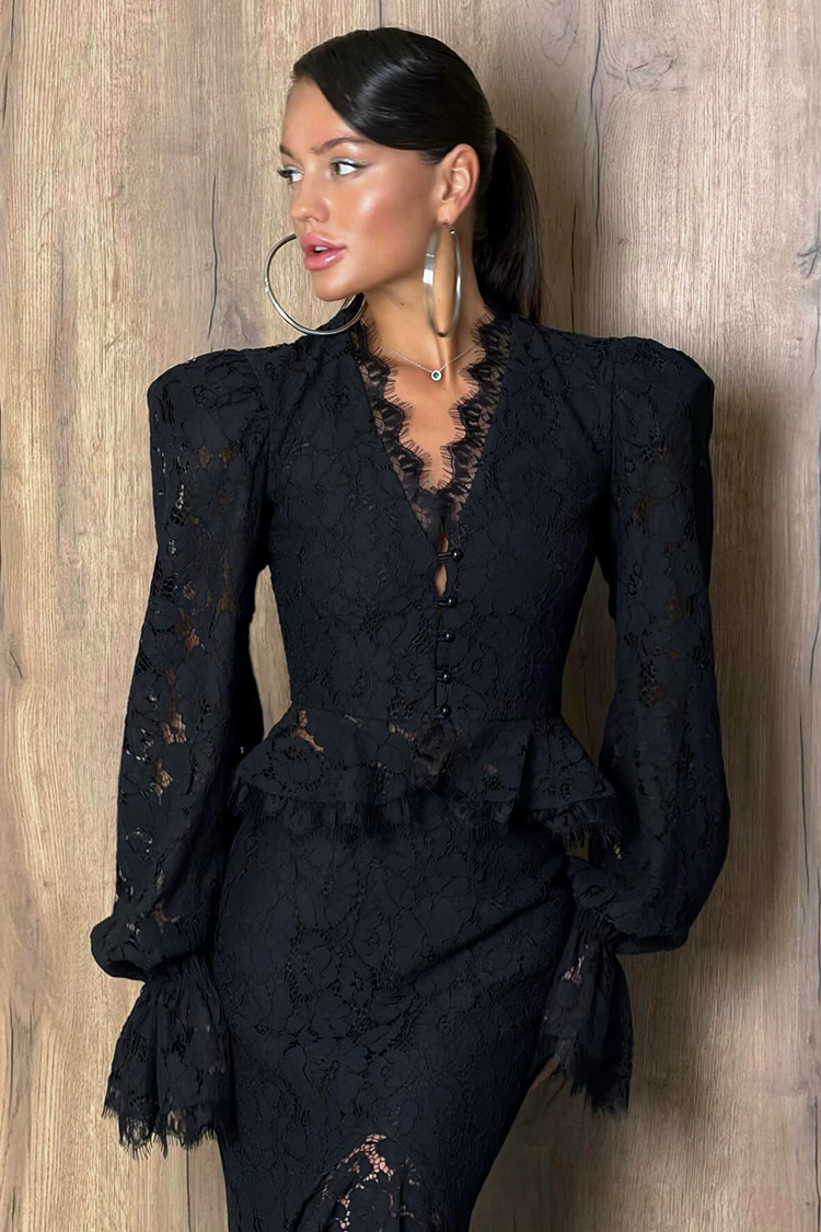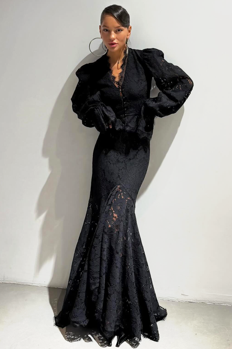 - Koszula ma długie, efektowne rękawy i stylowe guziki przy dekolcie. Spódnica ma wysoki stan i jest długa.
