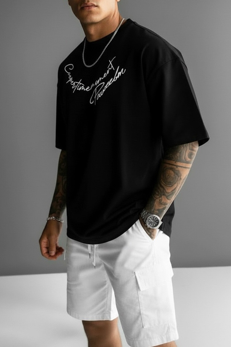 - Nowoczesny męski T-shirt o wygodnym kroju z nadrukiem wokół dekoltu, odpowiedni na co dzień, na spacer lub jako dodatek do sportowej stylizacji.