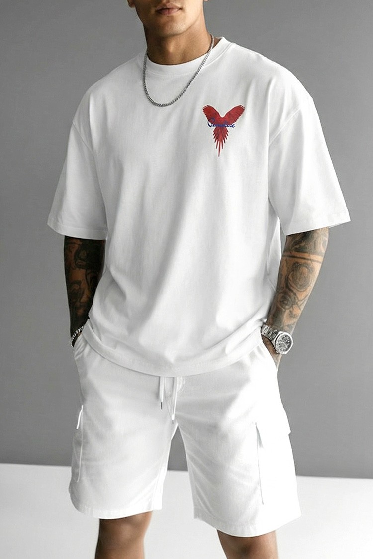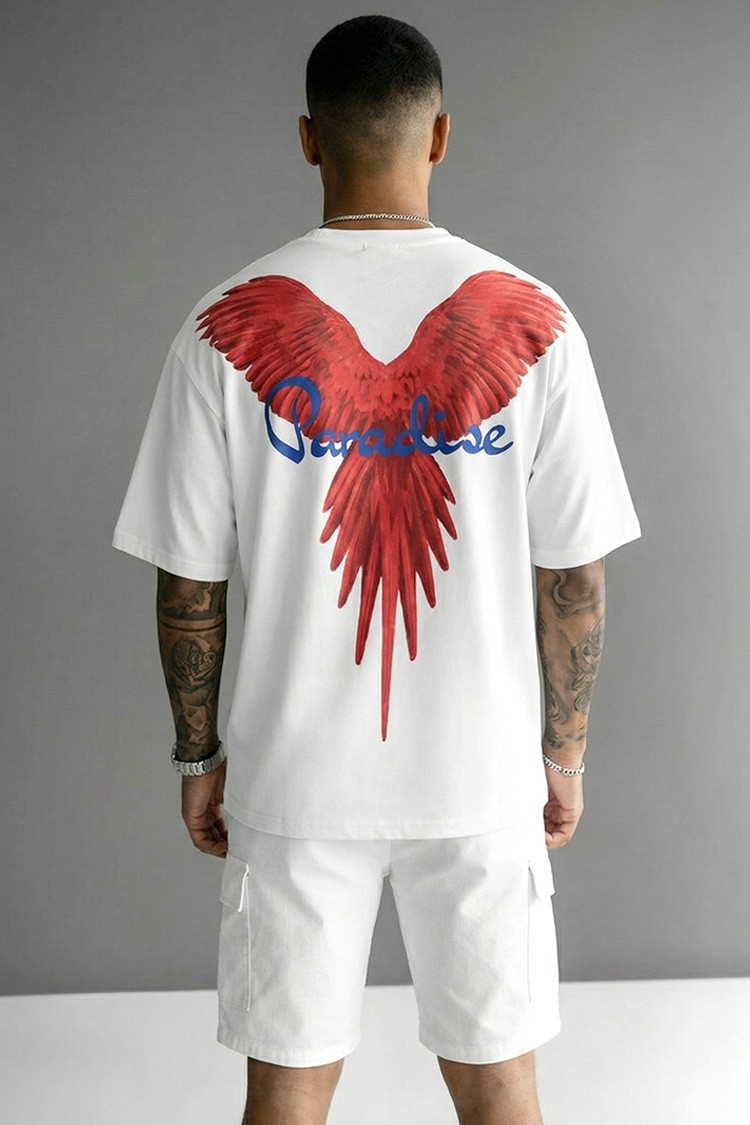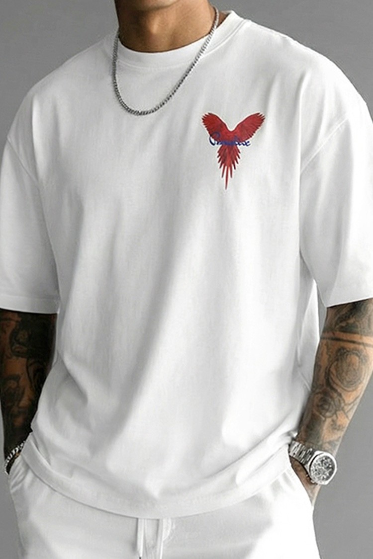 - Nowoczesny męski T-shirt o wygodnym kroju z nadrukiem z przodu i z tyłu, odpowiedni na co dzień, na spacery lub jako dodatek do sportowej stylizacji.