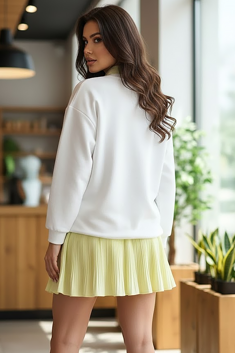 - Spódnica ma krótki krój i zakładki, a koszula klasyczny krój i kołnierzyk.