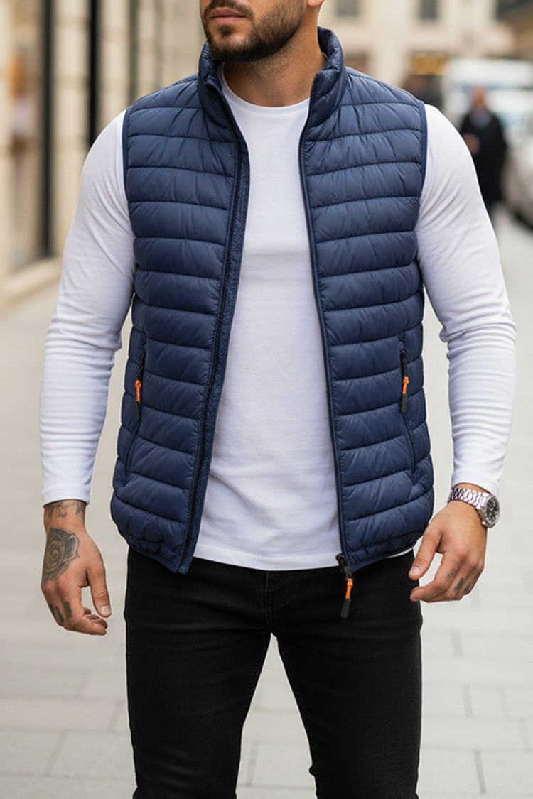 - Sportowo-codzienna męska kamizelka z pikowaną strukturą i wysokim kołnierzem w kolorze szarym.