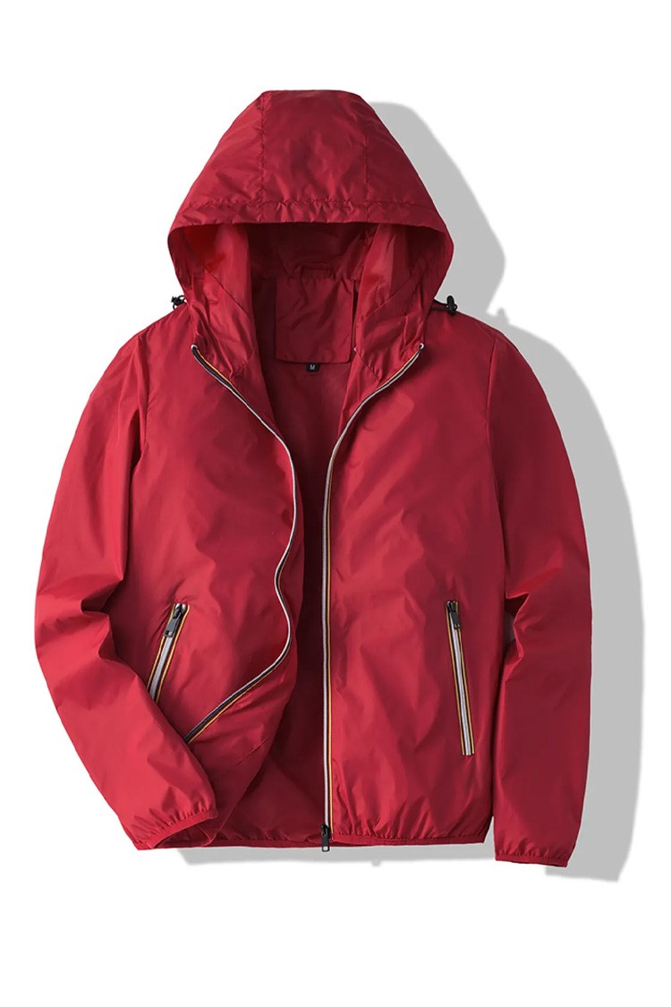 - Podstawowy model męskiej kurtki w kolorze czerwonym o sportowym, codziennym stylu, odpowiedni na okres przejściowy.