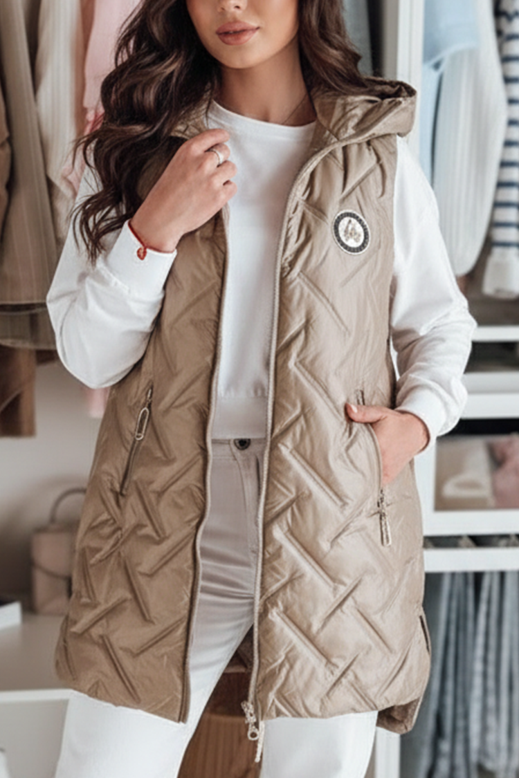- Kamizelka ma klasyczny krój, kołnierz, kieszenie, pikowany wzór i kaptur.