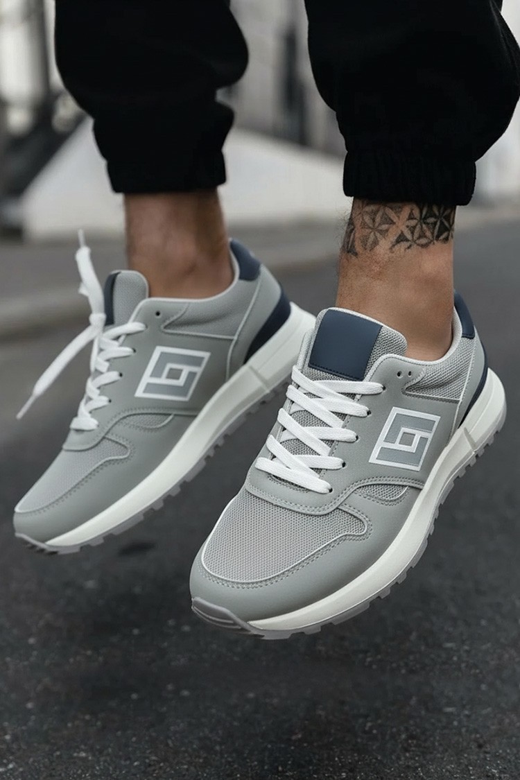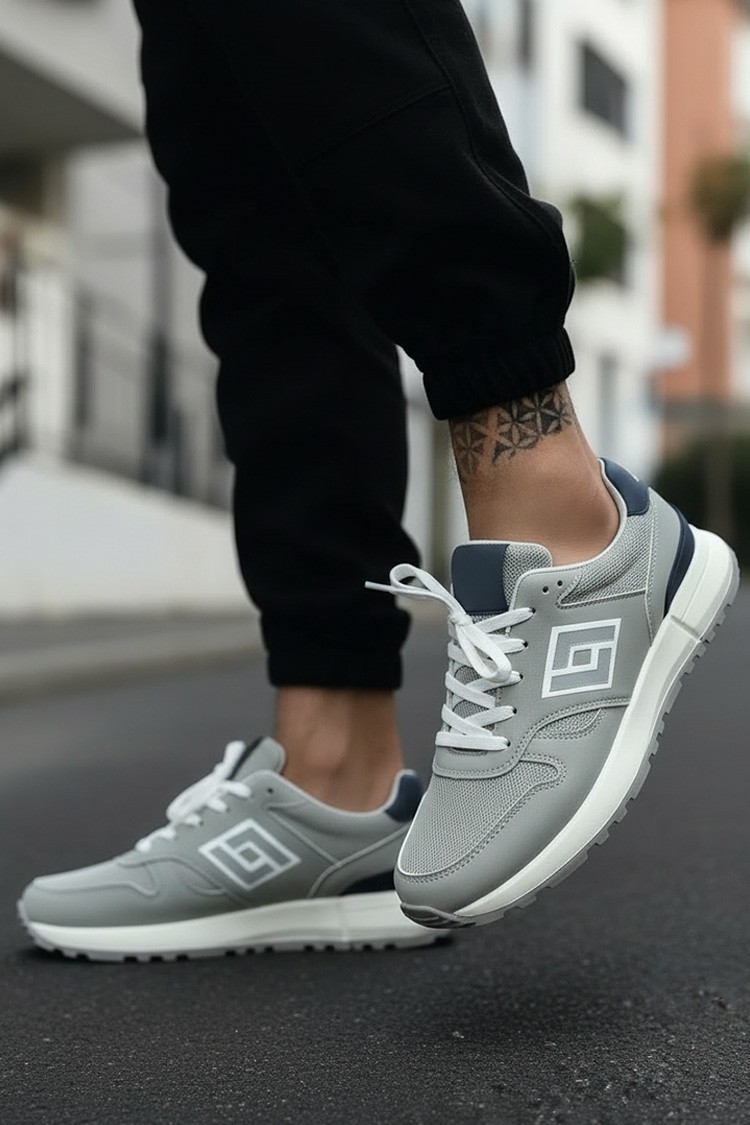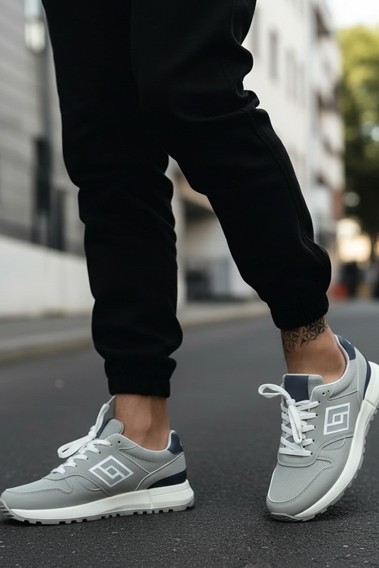 - Męskie sneakersy w kolorze szarym, idealne na co dzień, do uprawiania sportu lub na spacery.
