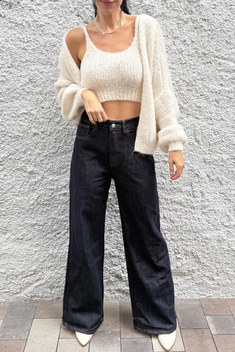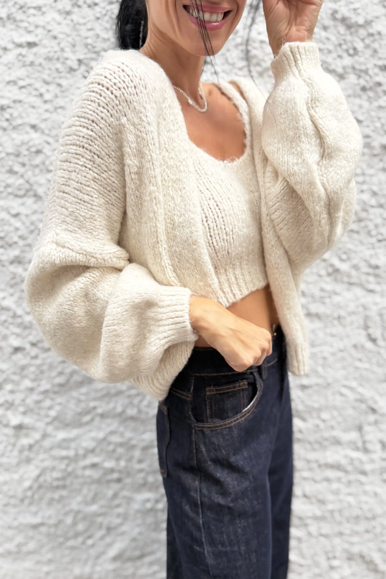 - Góra ma dopasowany krój i skróconą długość, a kardigan ma długie rękawy i klasyczny krój.