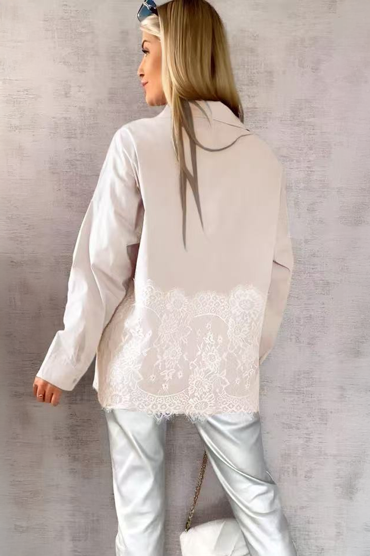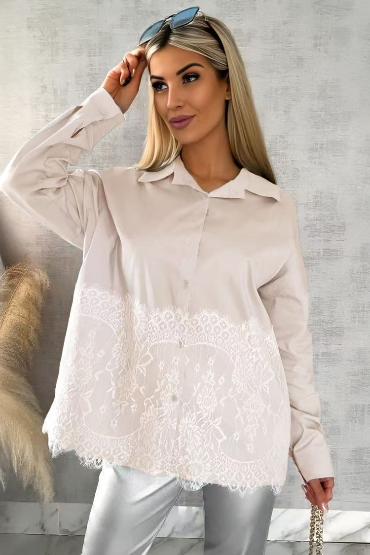- Model ma długie rękawy, klasyczny krój, kołnierzyk, guziki i atrakcyjną koronkę.