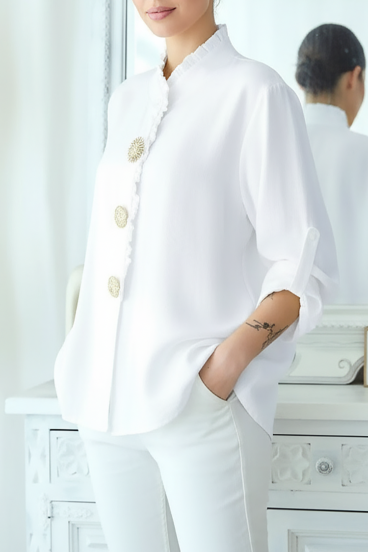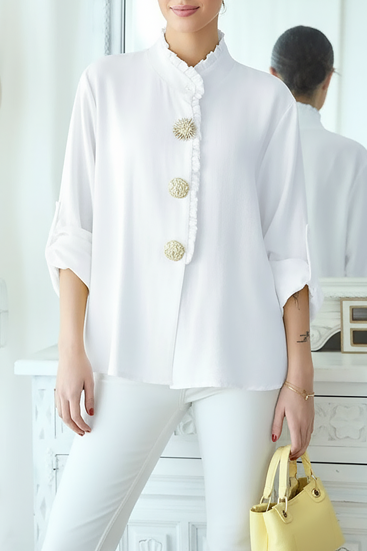 - Model ma długie, podwijane rękawy, efektowny kołnierzyk i guziki.