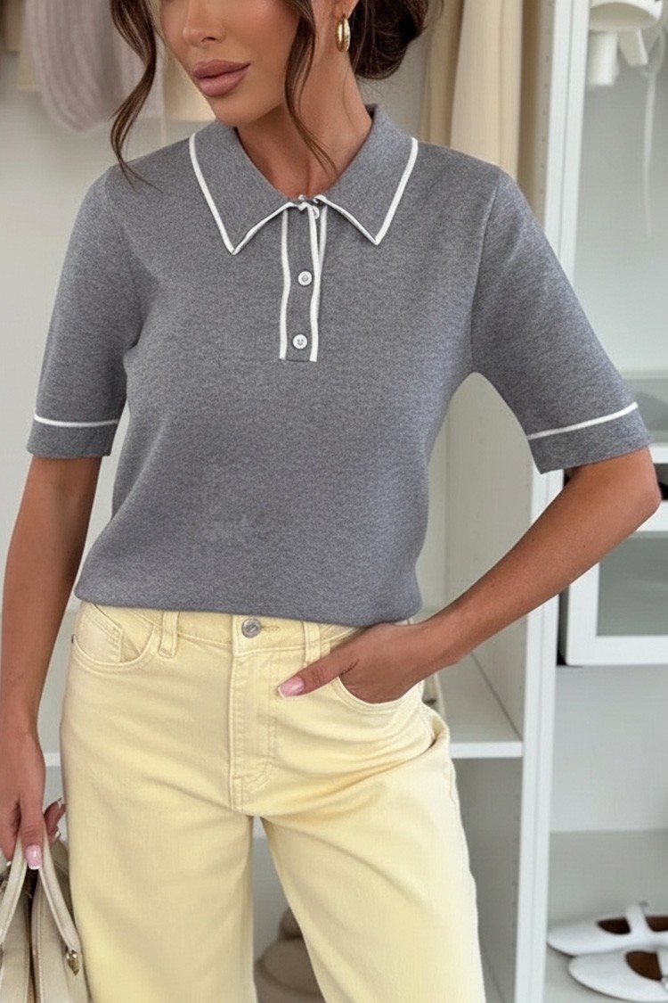 - Model ma krótkie rękawy, atrakcyjny kołnierzyk, guziki i białe detale.
