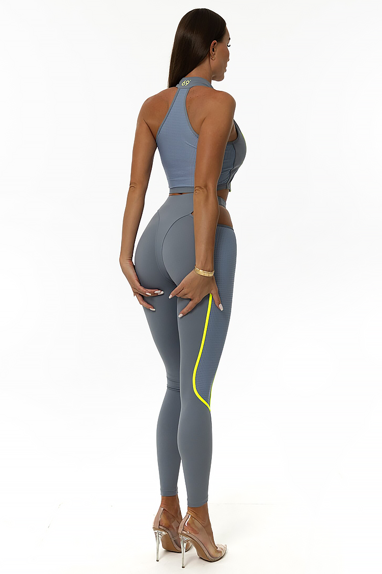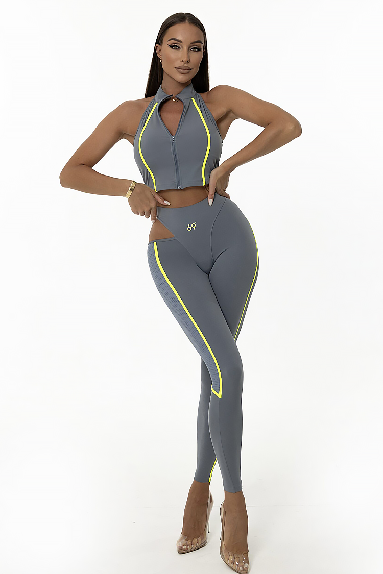 - Top ma dopasowany, krótki krój i zamek błyskawiczny, a legginsy mają wysoki stan i dopasowany krój.