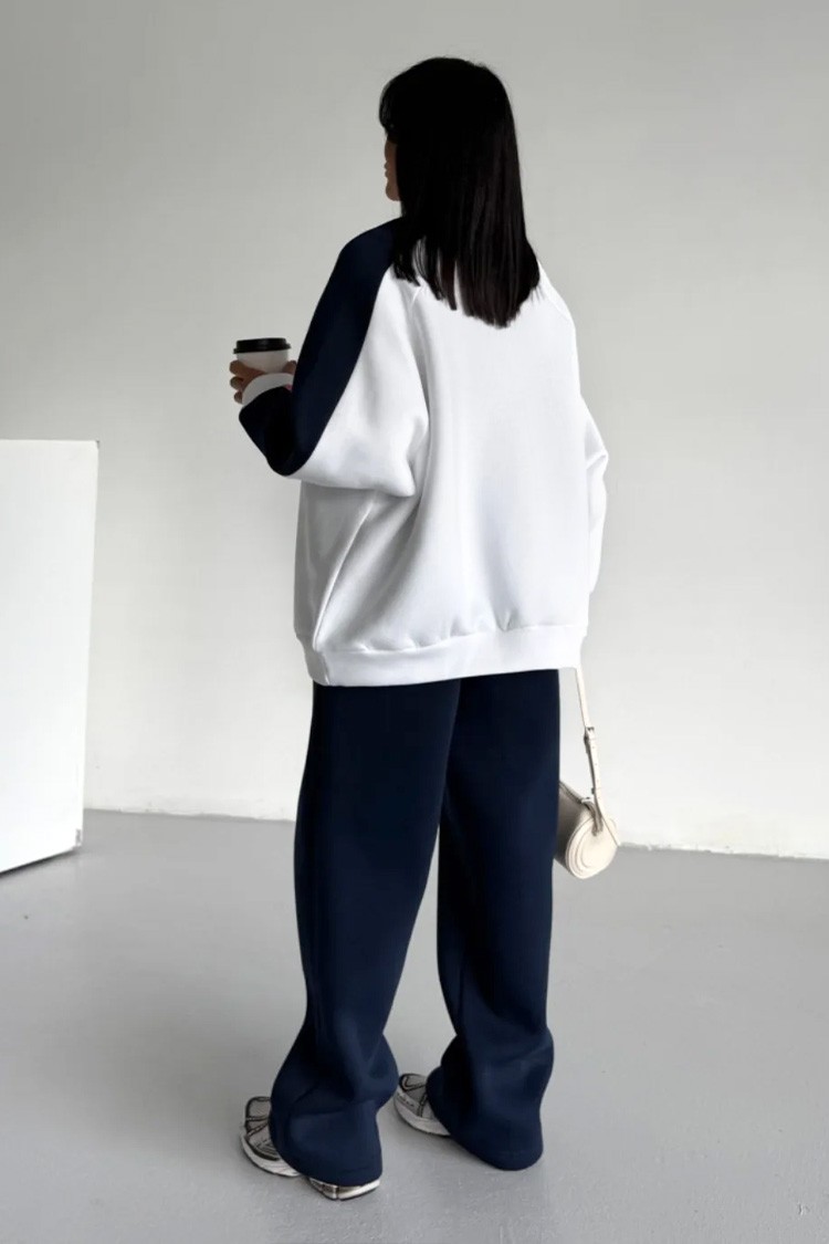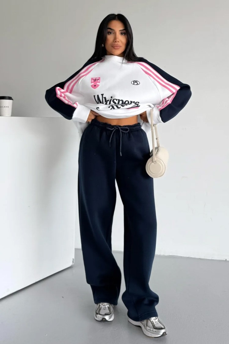 - Spodnie mają wysoki stan i wygodne nogawki.