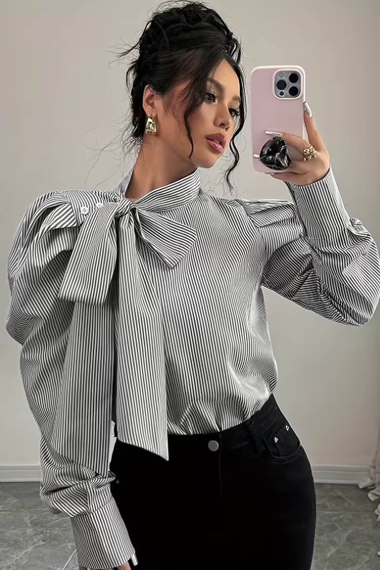 - Model ma długie rękawy, atrakcyjny krój, wstążkę i wzór w paski.