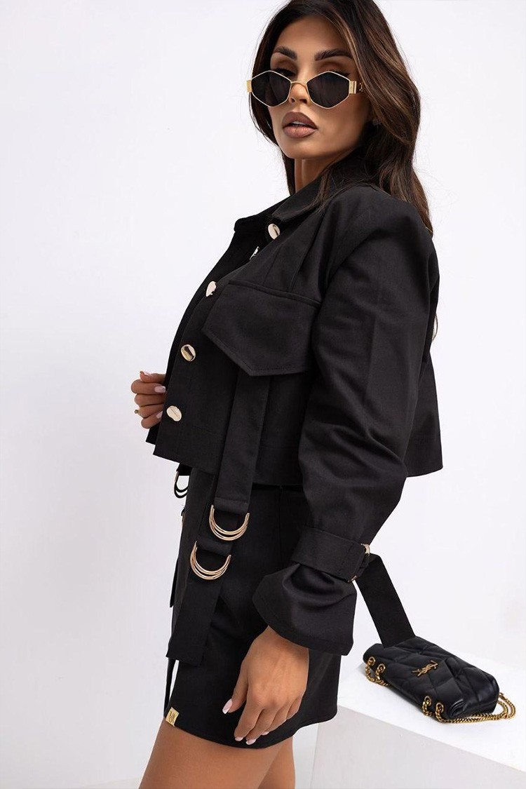 - Marynarka ma skróconą długość i zapinany jest na guziki na całej długości.