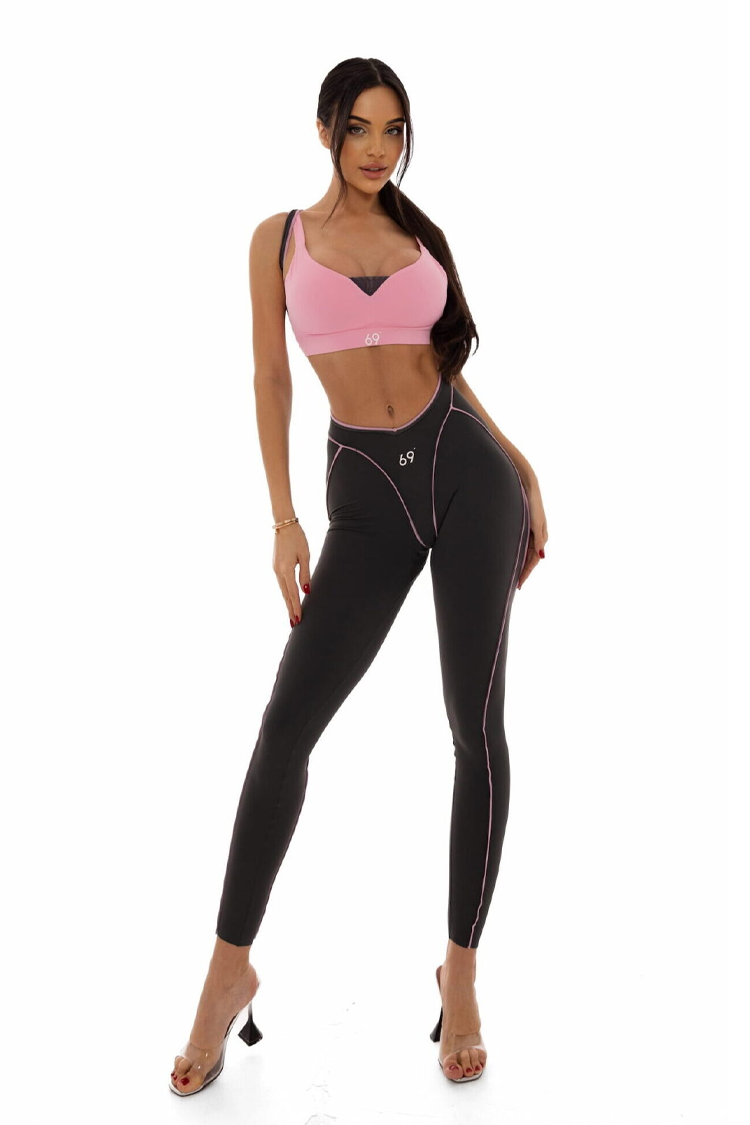 - Góra ma dopasowany krój z wycięciami, a legginsy podkreślają kobiece kształty.