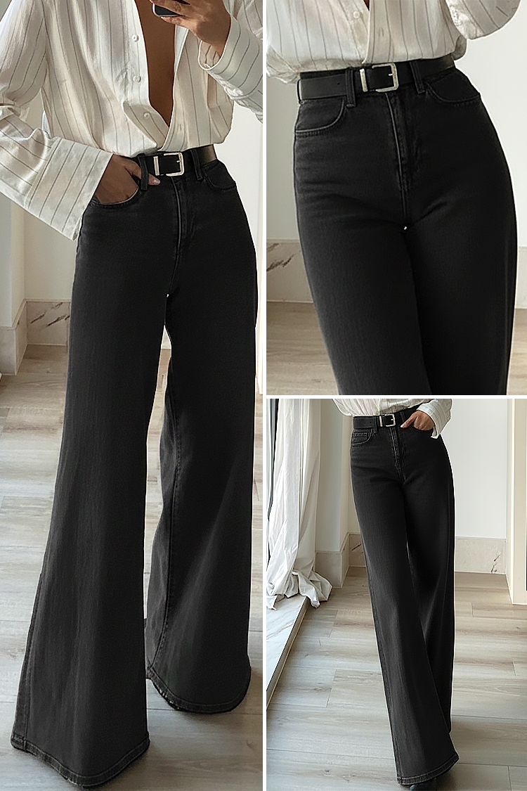 - Model ma wysoki stan i rozszerzane nogawki, jest w kolorze czarnym i ma atrakcyjny pasek.