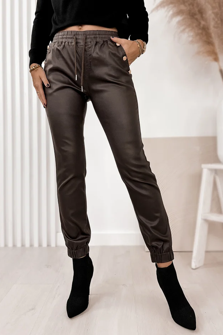 - Aby wyglądać stylowo, wybierz te efektowne spodnie w kolorze ciemnobrązowym.