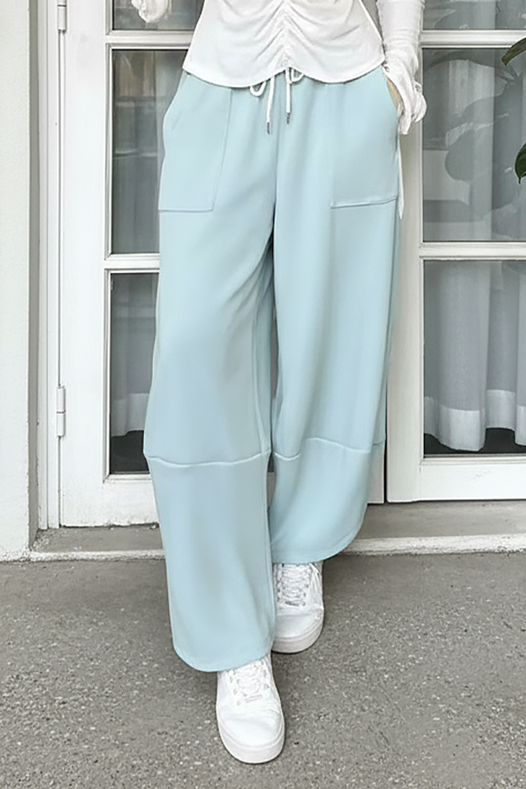 - Model ma wysoki stan ze ściągaczami i wygodne nogawki.