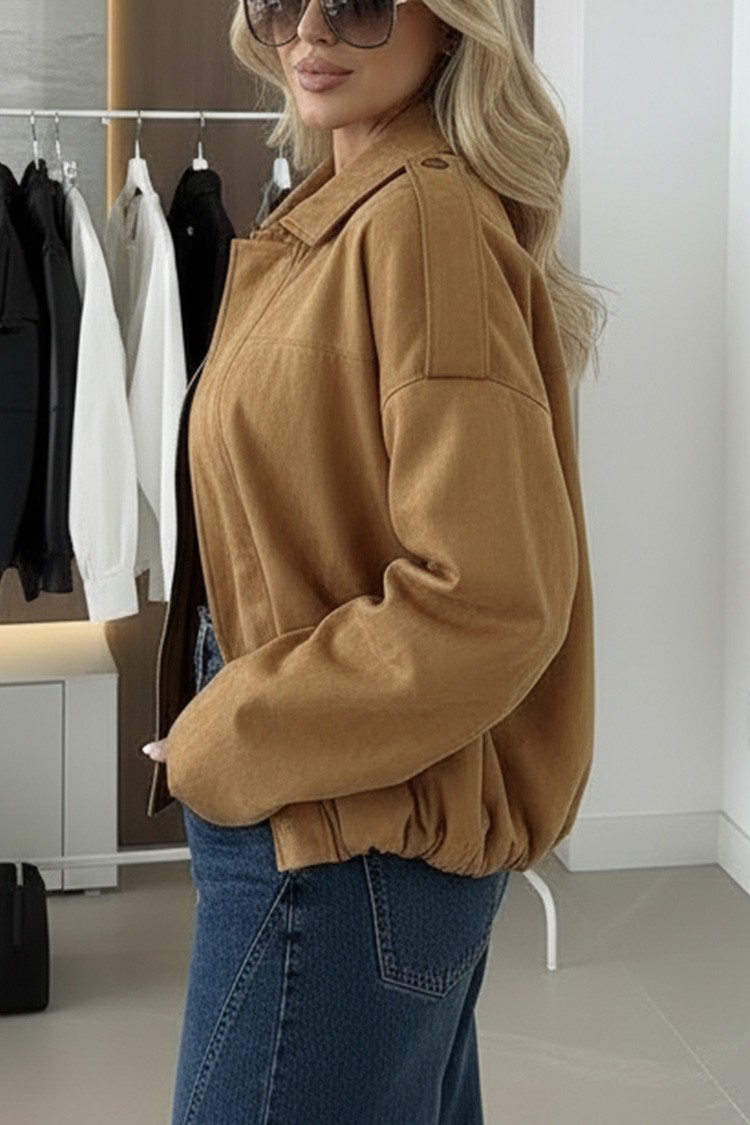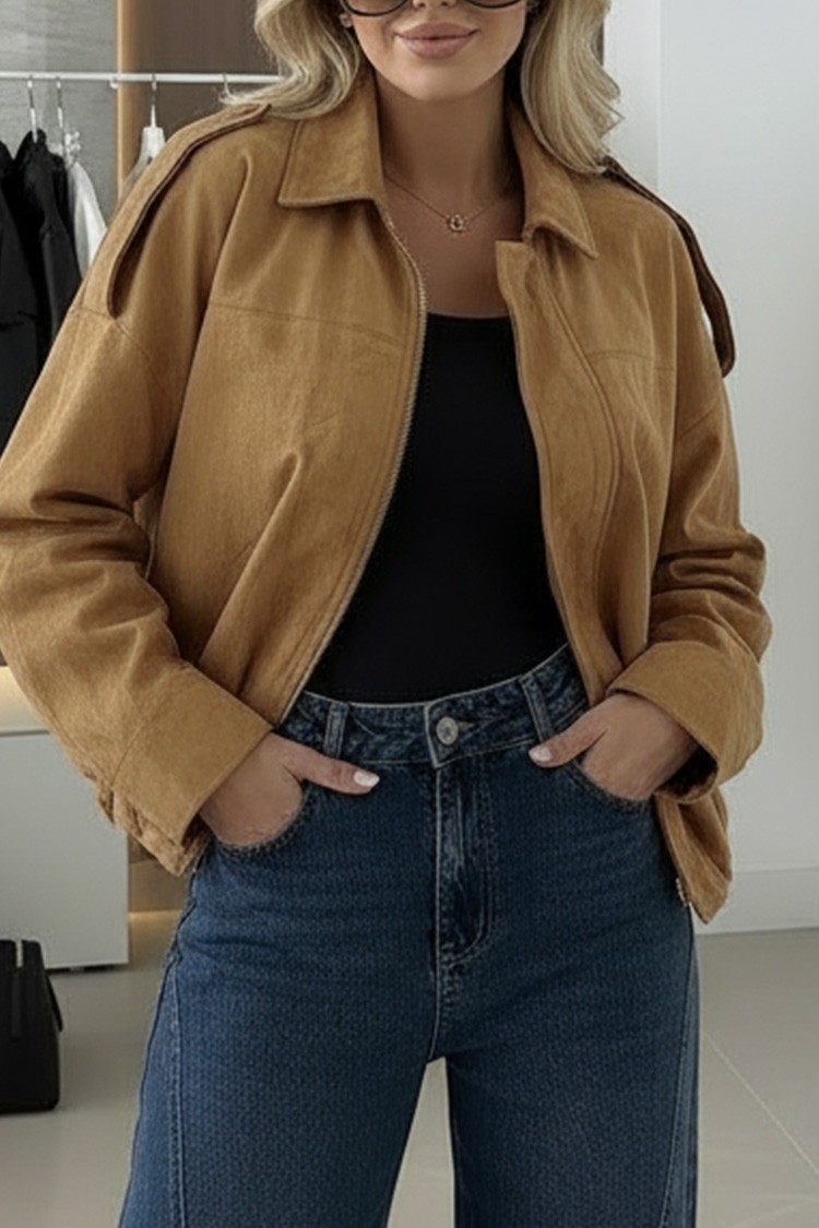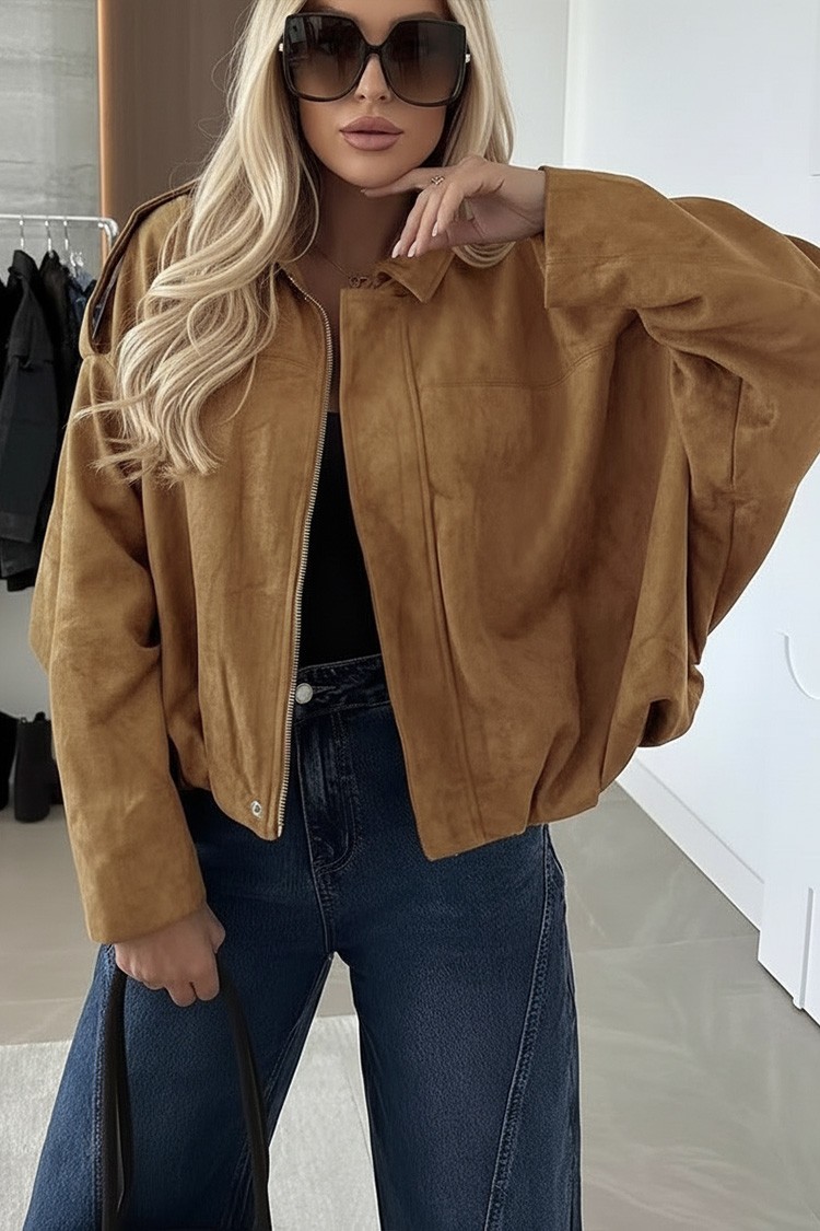- Model ma oversize'owy krój, wykonany jest z ekologicznego zamszu i zapinany jest na zamek błyskawiczny z przodu.
