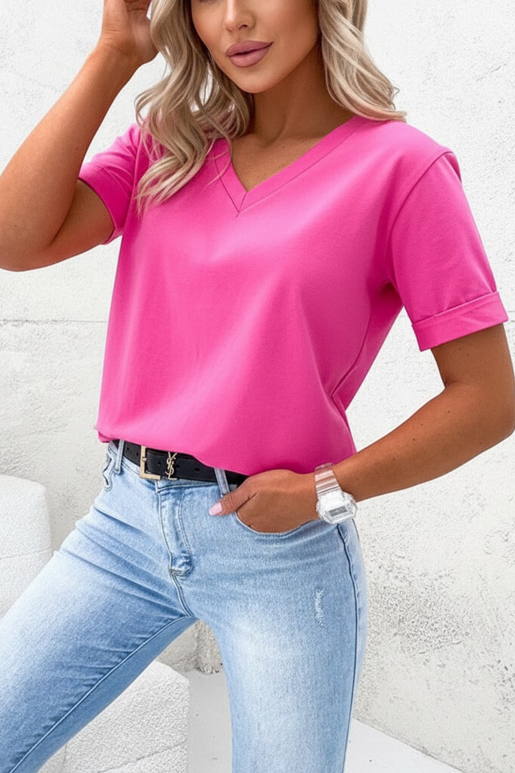 - Model ma krótkie rękawy, dekolt, klasyczny krój i różowy kolor.